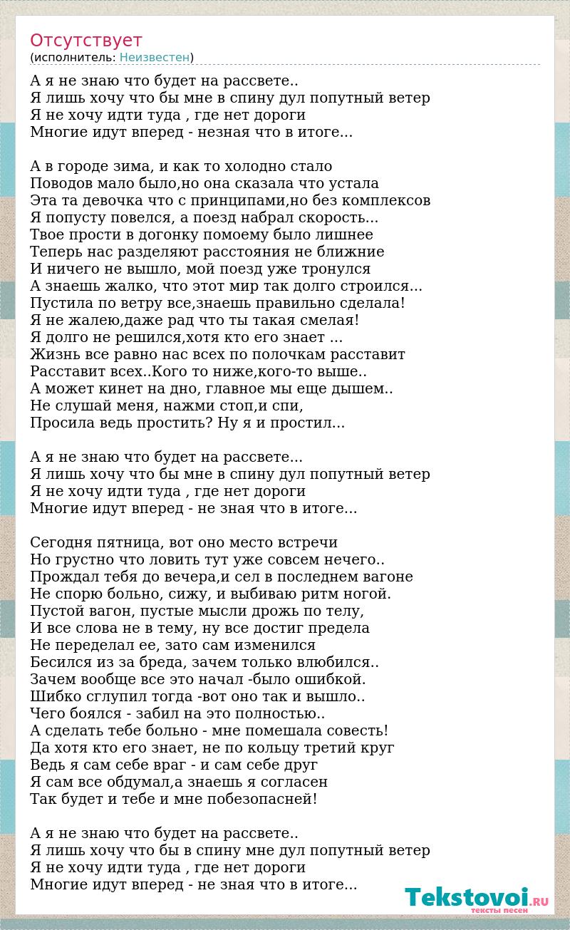 А я не знаю что будет на рассвете.. Я лишь хочу что бы мне в спину дул попутный ветер Я не хочу идти туда , где нет дороги Многие идут вперед - незная что в итоге... А в городе зима, и как то холодно стало Поводов мало было,но она сказала что устала Эта та девочка что с принципами,но без комплексов Я попусту повелся, а поезд набрал скорость... Твое прости в догонку помоему было лишнее Теперь нас разделяют расстояния не ближние И ничего не вышло, мой поезд уже тронулся А знаешь жалко, что этот мир так долго строился... Пустила по ветру все,знаешь правильно сделала! Я не жалею,даже рад что ты такая смелая! Я долго не решился,хотя кто его знает ... Жизнь все равно нас всех по полочкам расставит Расставит всех..Кого то ниже,кого-то выше.. А может кинет на дно, главное мы еще дышем.. Не слушай меня, нажми стоп,и спи, Просила ведь простить? Ну я и простил... А я не знаю что будет на рассвете... Я лишь хочу что бы мне в спину дул попутный ветер Я не хочу идти туда , где нет дороги Многие идут вперед - не зная что в итоге... Сегодня пятница, вот оно место встречи Но грустно что ловить тут уже совсем нечего.. Прождал тебя до вечера,и сел в последнем вагоне Не спорю больно, сижу, и выбиваю ритм ногой. Пустой вагон, пустые мысли дрожь по телу, И все слова не в тему, ну все достиг предела Не переделал ее, зато сам изменился Бесился из за бреда, зачем только влюбился.. Зачем вообще все это начал -было ошибкой. Шибко сглупил тогда -вот оно так и вышло.. Чего боялся - забил на это полностью.. А сделать тебе больно - мне помешала совесть! Да хотя кто его знает, не по кольцу третий круг Ведь я сам себе враг - и сам себе друг Я сам все обдумал,а знаешь я согласен Так будет и тебе и мне побезопасней! А я не знаю что будет на рассвете.. Я лишь хочу что бы в спину мне дул попутный ветер Я не хочу идти туда , где нет дороги Многие идут вперед - не зная что в итоге...