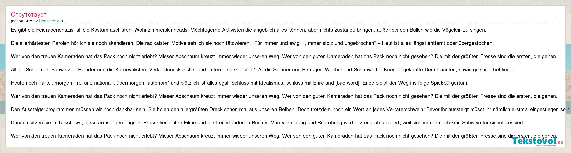 Es gibt die Feierabendnazis, all die Kostümfaschisten, Wohnzimmerskinheads, Möchtegerne-Aktivisten die angeblich alles können, aber nichts zustande bringen, außer bei den Bullen wie die Vögelein zu singen. Die allerhärtesten Parolen hör ich sie noch skandieren. Die radikalsten Motive seh ich sie noch tätowieren. „Für immer und ewig“, „Immer stolz und ungebrochen“ – Heut ist alles längst entfernt oder übergestochen. Wer von den treuen Kameraden hat das Pack noch nicht erlebt? Mieser Abschaum kreuzt immer wieder unseren Weg. Wer von den guten Kameraden hat das Pack noch nicht gesehen? Die mit der größten Fresse sind die ersten, die gehen. All die Schleimer, Schwätzer, Blender und die Karnevalisten, Verkleidungskünstler und „Internetspezialisten“. All die Spinner und Betrüger, Wochenend-Schönwetter-Krieger, gekaufte Denunzianten, sowie geistige Tiefflieger. Heute noch Partei, morgen „frei und national“, übermorgen „autonom“ und plötzlich ist alles egal. Schluss mit Idealismus, schluss mit Ehre und [bad word] Ende bleibt der Weg ins feige Spießbürgertum. Wer von den treuen Kameraden hat das Pack noch nicht erlebt? Mieser Abschaum kreuzt immer wieder unseren Weg. Wer von den guten Kameraden hat das Pack noch nicht gesehen? Die mit der größten Fresse sind die ersten, die gehen. Den Aussteigerprogrammen müssen wir noch dankbar sein. Sie holen den allergrößten Dreck schon mal aus unseren Reihen. Doch trotzdem noch ein Wort an jedes Verräterschwein: Bevor ihr aussteigt müsst ihr nämlich erstmal eingestiegen sein. Danach sitzen sie in Talkshows, diese armseligen Lügner. Präsentieren ihre Filme und die frei erfundenen Bücher. Von Verfolgung und Bedrohung wird letztendlich fabuliert, weil sich immer noch kein Schwein für sie interessiert. Wer von den treuen Kameraden hat das Pack noch nicht erlebt? Mieser Abschaum kreuzt immer wieder unseren Weg. Wer von den guten Kameraden hat das Pack noch nicht gesehen? Die mit der größten Fresse sind die ersten, die gehen.