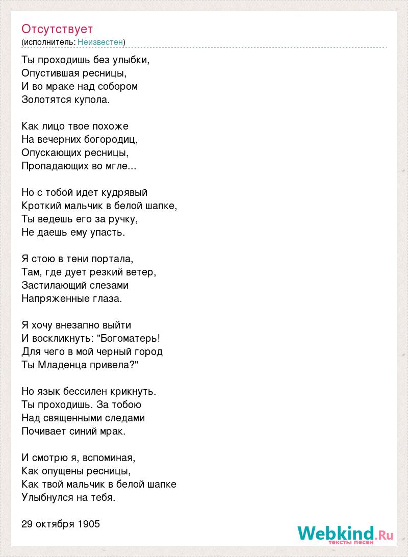 Ты проходишь без улыбки, Опустившая ресницы, И во мраке над собором Золотятся купола. Как лицо твое похоже На вечерних богородиц, Опускающих ресницы, Пропадающих во мгле... Но с тобой идет кудрявый Кроткий мальчик в белой шапке, Ты ведешь его за ручку, Не даешь ему упасть. Я стою в тени портала, Там, где дует резкий ветер, Застилающий слезами Напряженные глаза. Я хочу внезапно выйти И воскликнуть: "Богоматерь! Для чего в мой черный город Ты Младенца привела?" Но язык бессилен крикнуть. Ты проходишь. За тобою Над священными следами Почивает синий мрак. И смотрю я, вспоминая, Как опущены ресницы, Как твой мальчик в белой шапке Улыбнулся на тебя. 29 октября 1905