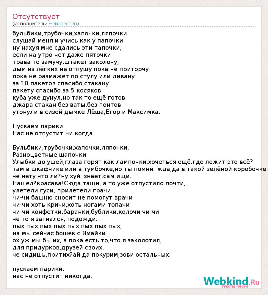 бульбики,трубочки,хапочки,ляпочки слушай меня и учись как у папочки ну нахуя мне сдались эти тапочки, если на утро нет даже пяточки трава то замучу,штакет заколочу, дым из лёгких не отпущу пока не приторчу пока не размажет по стулу или дивану за 10 пакетов спасибо стакану. пакету спасибо за 5 косяков куба уже дунул,но так то ещё готов джара стакан без ваты,без понтов утонули в сизой дымке Лёша,Егор и Максимка. Пускаем парики. Нас не отпустит ни когда. Бульбики,трубочки,хапочки,ляпочки, Разноцветные шапочки Улыбки до ушей,глаза горят как лампочки,хочеться ещё.где лежит это всё? там в шкафчике или в тумбочке,но ты помни жда,да в такой зелёной коробочке. че нету что ли?ну хуй знает,сам ищи. Нашел?красава!Сюда тащи, а то уже отпустило почти, улетели гуси, прилетели грачи чи-чи башню сносит не помогут врачи чи-чи хоть кричи,хоть ногами топачи чи-чи конфетки,баранки,бублики,колочи чи-чи че то я загнался, подожди. пых пых пых пых пых пых пых пых, на мы сейчас бошек с Ямайки ох уж мы бы их, а пока есть то,что я заколотил, для придурков,друзей своих. че сидишь,притих?ай да покурим,зови остальных. пускаем парики. нас не отпустит никогда.