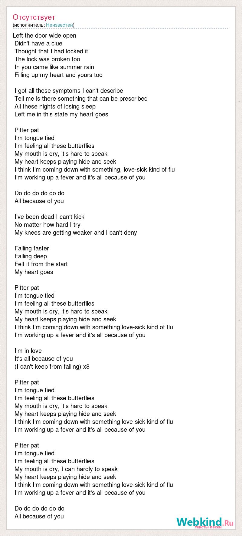 Left the door wide open Didn't have a clue Thought that I had locked it The lock was broken too In you came like summer rain Filling up my heart and yours too I got all these symptoms I can't describe Tell me is there something that can be prescribed All these nights of losing sleep Left me in this state my heart goes Pitter pat I'm tongue tied I'm feeling all these butterflies My mouth is dry, it's hard to speak My heart keeps playing hide and seek I think [bad word] down with something, love-sick kind of flu I'm working up a fever and it's all because of you Do do do do do do All because of you I've been dead I can't kick No matter how hard I try My knees are getting weaker and I can't deny Falling faster Falling deep Felt it from the start My heart goes Pitter pat I'm tongue tied I'm feeling all these butterflies My mouth is dry, it's hard to speak My heart keeps playing hide and seek I think [bad word] down with something love-sick kind of flu I'm working up a fever and it's all because of you I'm in love It's all because of you (I can't keep from falling) x8 Pitter pat I'm tongue tied I'm feeling all these butterflies My mouth is dry, it's hard to speak My heart keeps playing hide and seek I think [bad word] down with something love-sick kind of flu I'm working up a fever and it's all because of you Pitter pat I'm tongue tied I'm feeling all these butterflies My mouth is dry, I can hardly to speak My heart keeps playing hide and seek I think [bad word] down with something love-sick kind of flu I'm working up a fever and it's all because of you Do do do do do do All because of you