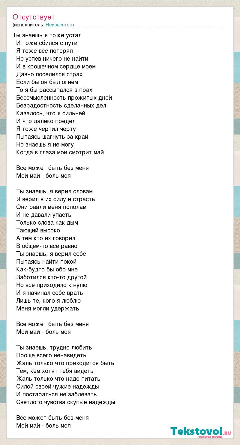 Ты знаешь я тоже устал И тоже сбился с пути Я тоже все потерял Не успев ничего не найти И в крошечном сердце моем Давно поселился страх Если бы он был огнем То я бы рассыпался в прах Бессмысленность прожитых дней Безрадостность сделанных дел Казалось, что я сильней И что далеко предел Я тоже чертил черту Пытаясь шагнуть за край Но знаешь я не могу Когда в глаза мои смотрит май Все может быть без меня Мой май - боль моя Ты знаешь, я верил словам Я верил в их силу и страсть Они рвали меня пополам И не давали упасть Только слова как дым Тающий высоко А тем кто их говорил В общем-то все равно Ты знаешь, я верил себе Пытаясь найти покой Как-будто бы обо мне Заботился кто-то другой Но все приходило к нулю И я начинал себе врать Лишь те, кого я люблю Меня могли удержать Все может быть без меня Мой май - боль моя Ты знаешь, трудно любить Проще всего ненавидеть Жаль только что приходится быть Тем, кем хотят тебя видеть Жаль только что надо питать Силой своей чужие надежды И постараться не заблевать Светлого чувства скупые надежды Все может быть без меня Мой май - боль моя