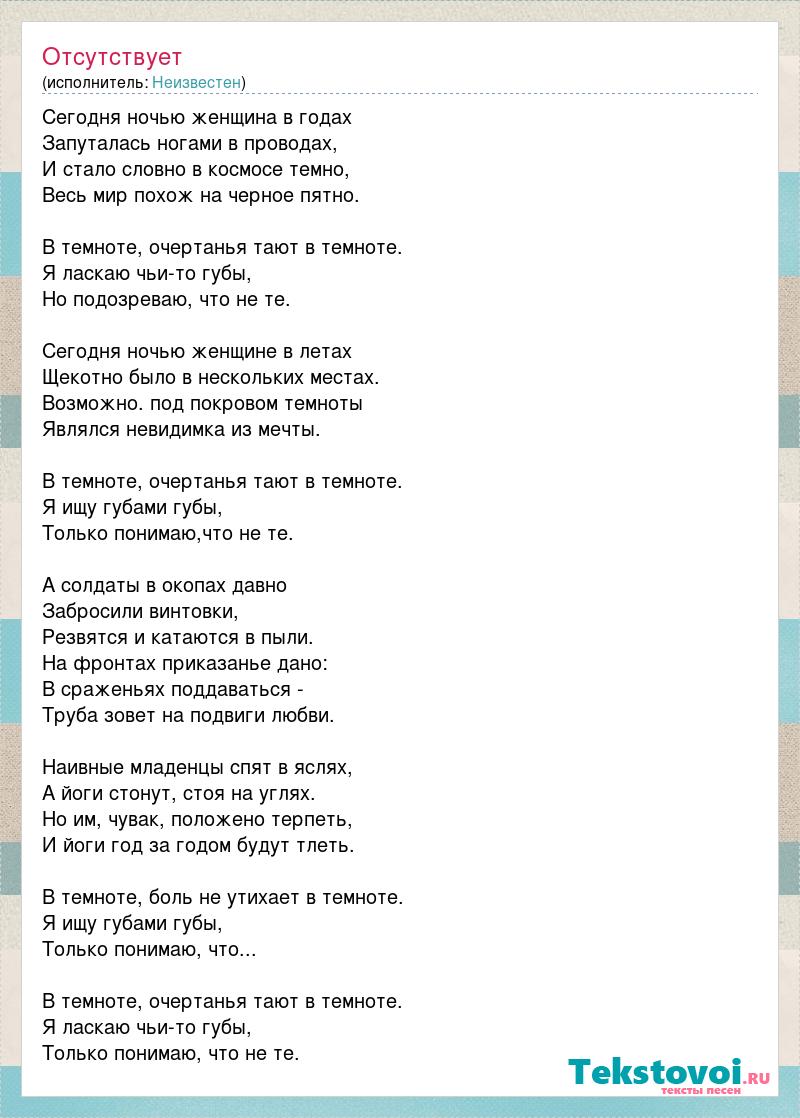 Сегодня ночью женщина в годах Запуталась ногами в проводах, И стало словно в космосе темно, Весь мир похож на черное пятно. В темноте, очертанья тают в темноте. Я ласкаю чьи-то губы, Но подозреваю, что не те. Сегодня ночью женщине в летах Щекотно было в нескольких местах. Возможно. под покровом темноты Являлся невидимка из мечты. В темноте, очертанья тают в темноте. Я ищу губами губы, Только понимаю,что не те. А солдаты в окопах давно Забросили винтовки, Резвятся и катаются в пыли. На фронтах приказанье дано: В сраженьях поддаваться - Труба зовет на подвиги любви. Наивные младенцы спят в яслях, А йоги стонут, стоя на углях. Но им, чувак, положено терпеть, И йоги год за годом будут тлеть. В темноте, боль не утихает в темноте. Я ищу губами губы, Только понимаю, что... В темноте, очертанья тают в темноте. Я ласкаю чьи-то губы, Только понимаю, что не те.
