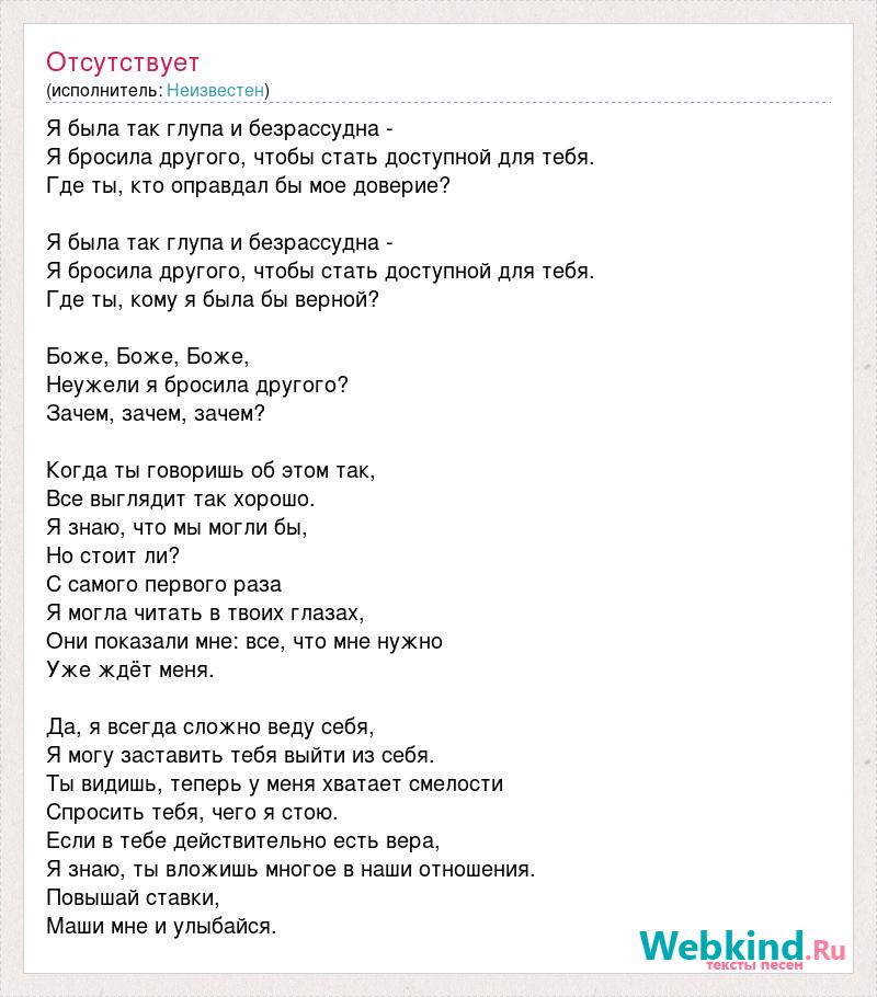 Я была так глупа и безрассудна - Я бросила другого, чтобы стать доступной для тебя. Где ты, кто оправдал бы мое доверие? Я была так глупа и безрассудна - Я бросила другого, чтобы стать доступной для тебя. Где ты, кому я была бы верной? Боже, Боже, Боже, Неужели я бросила другого? Зачем, зачем, зачем? Когда ты говоришь об этом так, Все выглядит так хорошо. Я знаю, что мы могли бы, Но стоит ли? С самого первого раза Я могла читать в твоих глазах, Они показали мне: все, что мне нужно Уже ждёт меня. Да, я всегда сложно веду себя, Я могу заставить тебя выйти из себя. Ты видишь, теперь у меня хватает смелости Спросить тебя, чего я стою. Если в тебе действительно есть вера, Я знаю, ты вложишь многое в наши отношения. Повышай ставки, Маши мне и улыбайся.