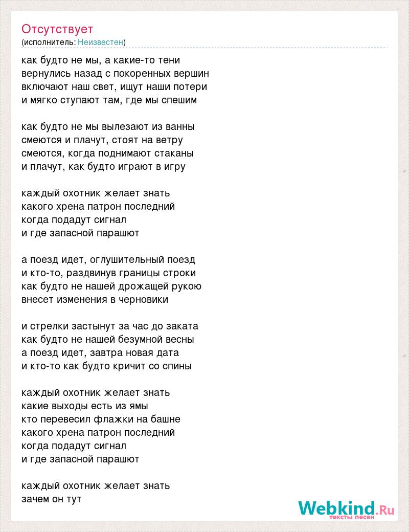 как будто не мы, а какие-то тени вернулись назад с покоренных вершин включают наш свет, ищут наши потери и мягко ступают там, где мы спешим как будто не мы вылезают из ванны смеются и плачут, стоят на ветру смеются, когда поднимают стаканы и плачут, как будто играют в игру каждый охотник желает знать какого хрена патрон последний когда подадут сигнал и где запасной парашют а поезд идет, оглушительный поезд и кто-то, раздвинув границы строки как будто не нашей дрожащей рукою внесет изменения в черновики и стрелки застынут за час до заката как будто не нашей безумной весны а поезд идет, завтра новая дата и кто-то как будто кричит со спины каждый охотник желает знать какие выходы есть из ямы кто перевесил флажки на башне какого хрена патрон последний когда подадут сигнал и где запасной парашют каждый охотник желает знать зачем он тут