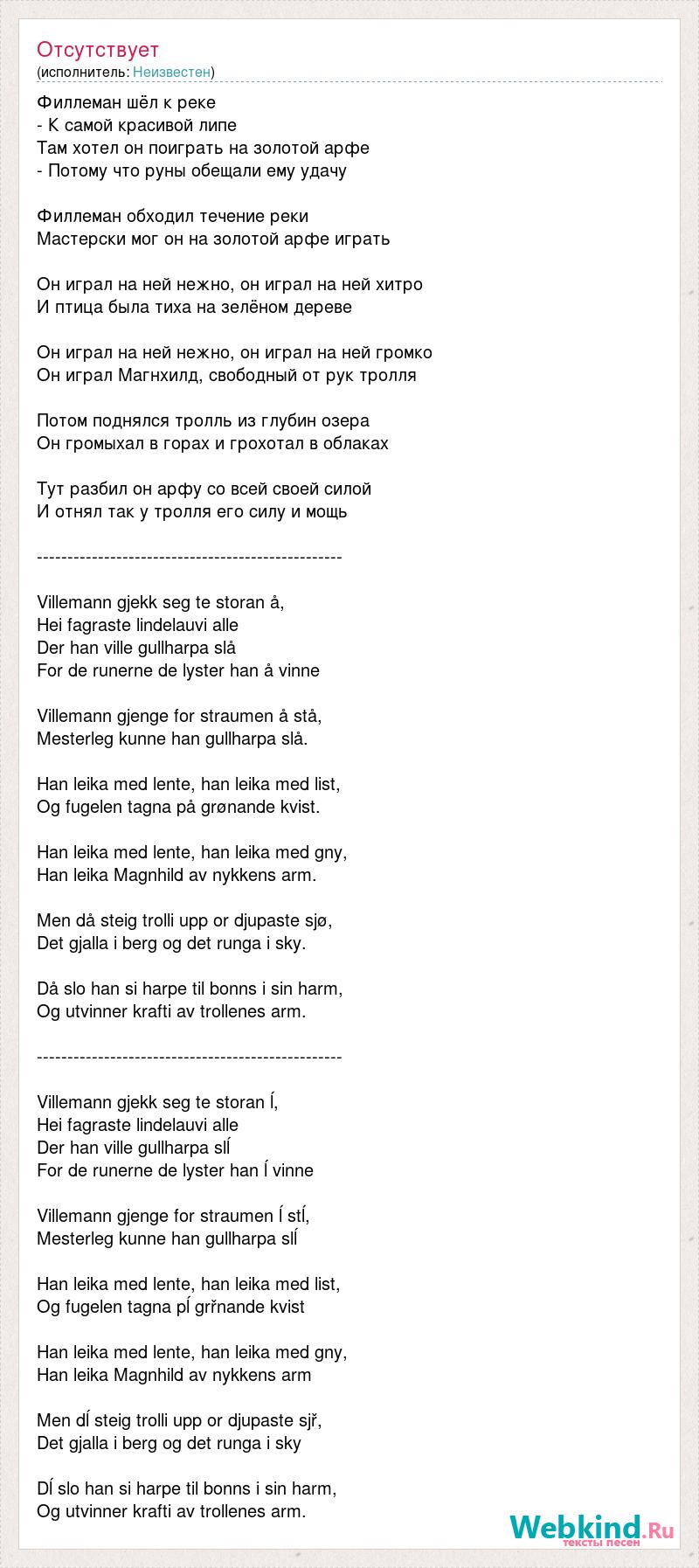 Филлеман шёл к реке - К самой красивой липе Там хотел он поиграть на золотой арфе - Потому что руны обещали ему удачу Филлеман обходил течение реки Мастерски мог он на золотой арфе играть Он играл на ней нежно, он играл на ней хитро И птица была тиха на зелёном дереве Он играл на ней нежно, он играл на ней громко Он играл Магнхилд, свободный от рук тролля Потом поднялся тролль из глубин озера Он громыхал в горах и грохотал в облаках Тут разбил он арфу со всей своей силой И отнял так у тролля его силу и мощь -------------------------------------------------- Villemann gjekk seg te storan å, Hei [bad word] lindelauvi alle Der han ville gullharpa slå For [bad word] de lyster han å vinne Villemann gjenge for straumen å stå, Mesterleg kunne han gullharpa slå. Han leika med lente, han leika med list, Og fugelen tagna på grønande kvist. Han leika med lente, han leika med gny, Han leika Magnhild av nykkens arm. Men då steig trolli upp or djupaste sjø, Det gjalla i berg og [bad word] i sky. Då slo han si harpe til bonns i sin harm, Og utvinner krafti av trollenes arm. -------------------------------------------------- Villemann gjekk seg te storan ĺ, Hei [bad word] lindelauvi alle Der han ville gullharpa slĺ For [bad word] de lyster han ĺ vinne Villemann gjenge for straumen ĺ stĺ, Mesterleg kunne han gullharpa slĺ Han leika med lente, han leika med list, Og fugelen tagna pĺ grřnande kvist Han leika med lente, han leika med gny, Han leika Magnhild av nykkens arm Men dĺ steig trolli upp or djupaste sjř, Det gjalla i berg og [bad word] i sky Dĺ slo han si harpe til bonns i sin harm, Og utvinner krafti av trollenes arm.