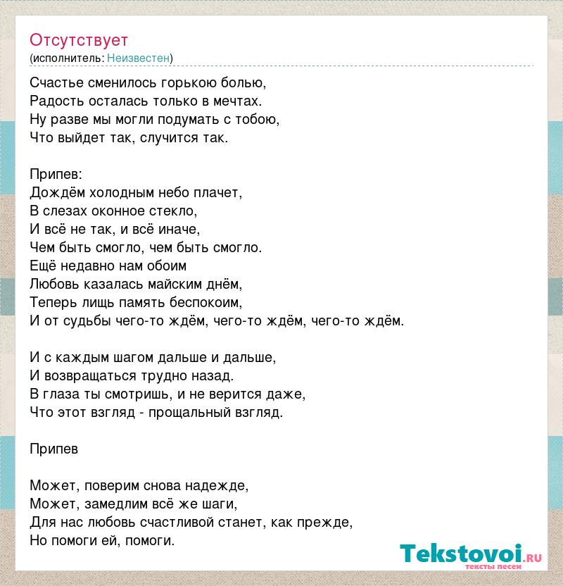 Счастье сменилось горькою болью, Радость осталась только в мечтах. Ну разве мы могли подумать с тобою, Что выйдет так, случится так. Припев: Дождём холодным небо плачет, В слезах оконное стекло, И всё не так, и всё иначе, Чем быть смогло, чем быть смогло. Ещё недавно нам обоим Любовь казалась майским днём, Теперь лищь память беспокоим, И от судьбы чего-то ждём, чего-то ждём, чего-то ждём. И с каждым шагом дальше и дальше, И возвращаться трудно назад. В глаза ты смотришь, и не верится даже, Что этот взгляд - прощальный взгляд. Припев Может, поверим снова надежде, Может, замедлим всё же шаги, Для нас любовь счастливой станет, как прежде, Но помоги ей, помоги.