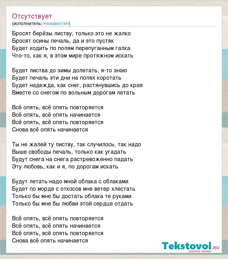 Бросят берёзы листву, только это не жалко Бросят осины печаль, да и это пустяк Будет ходить по полям перепуганным галка Что-то, как я, в этом мире протяжном искать Будет листва до зимы долетать, я-то знаю Будет печаль эти дни на полях коротать Будет надежда, как снег, растянувшись до края Вместе со снегом по вольным дорогам летать Всё опять, всё опять повторяется Всё опять, всё опять начинается Всё опять, всё опять повторяется Снова всё опять начинается Ты не жалей ту листву, так случилось, так надо Выше свободы печаль, только как угадать Будут снега на снега растревоженно падать Эту любовь, как и я, по дорогам искать Будут летать надо мной облака с облаками Будет по морде с откосов мне ветер хлестать Только бы мне бы достать облака те руками Только бы мне бы любви этой сердце отдать Всё опять, всё опять повторяется Всё опять, всё опять начинается Всё опять, всё опять повторяется Снова всё опять начинается