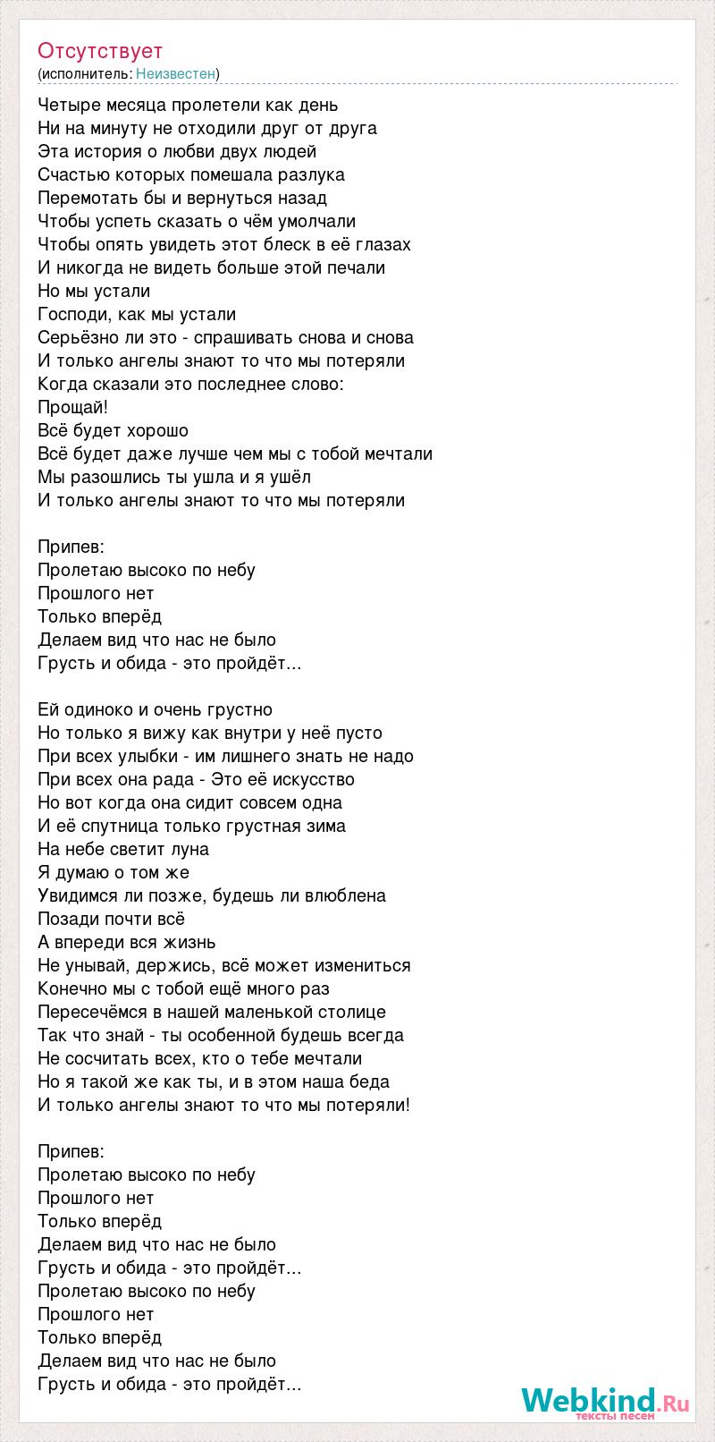 Четыре месяца пролетели как день Ни на минуту не отходили друг от друга Эта история о любви двух людей Счастью которых помешала разлука Перемотать бы и вернуться назад Чтобы успеть сказать о чём умолчали Чтобы опять увидеть этот блеск в её глазах И никогда не видеть больше этой печали Но мы устали Господи, как мы устали Серьёзно ли это - спрашивать снова и снова И только ангелы знают то что мы потеряли Когда сказали это последнее слово: Прощай! Всё будет хорошо Всё будет даже лучше чем мы с тобой мечтали Мы разошлись ты ушла и я ушёл И только ангелы знают то что мы потеряли Припев: Пролетаю высоко по небу Прошлого нет Только вперёд Делаем вид что нас не было Грусть и обида - это пройдёт... Ей одиноко и очень грустно Но только я вижу как внутри у неё пусто При всех улыбки - им лишнего знать не надо При всех она рада - Это её искусство Но вот когда она сидит совсем одна И её спутница только грустная зима На небе светит луна Я думаю о том же Увидимся ли позже, будешь ли влюблена Позади почти всё А впереди вся жизнь Не унывай, держись, всё может измениться Конечно мы с тобой ещё много раз Пересечёмся в нашей маленькой столице Так что знай - ты особенной будешь всегда Не сосчитать всех, кто о тебе мечтали Но я такой же как ты, и в этом наша беда И только ангелы знают то что мы потеряли! Припев: Пролетаю высоко по небу Прошлого нет Только вперёд Делаем вид что нас не было Грусть и обида - это пройдёт... Пролетаю высоко по небу Прошлого нет Только вперёд Делаем вид что нас не было Грусть и обида - это пройдёт...