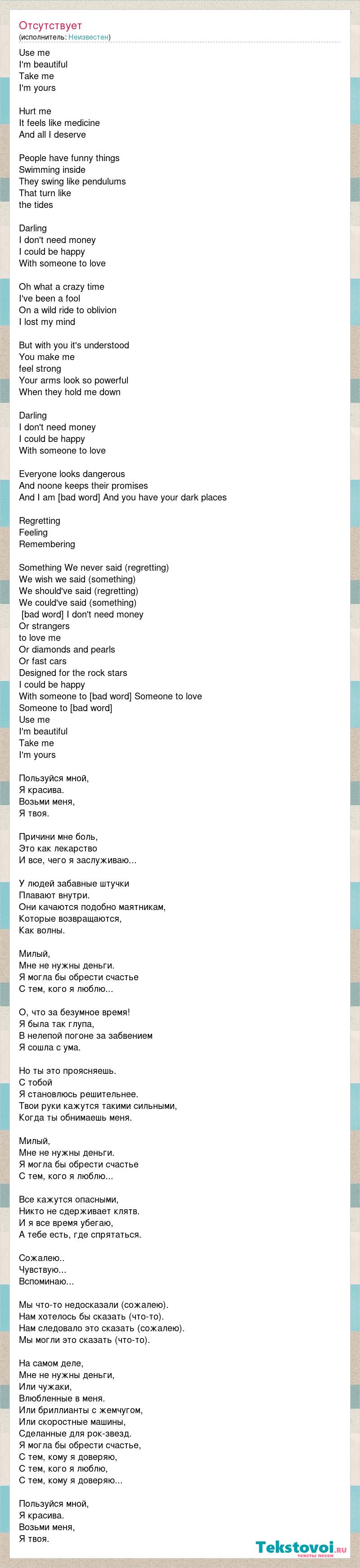 Use me I'm beautiful Take me I'm yours Hurt me It feels like medicine And all I deserve People have funny things Swimming inside They swing like pendulums That turn like the tides Darling I don't need money I could be happy With someone to love Oh what a crazy time I've been a fool On a wild ride to oblivion I lost my mind But with you it's understood You make me feel strong Your arms look so powerful When they hold me down Darling I don't need money I could be happy With someone to love Everyone looks dangerous And noone keeps their promises And I am [bad word] And you have your dark places Regretting Feeling Remembering Something We never said (regretting) We wish we said (something) We should've said (regretting) We could've said (something) [bad word] I don't need money Or strangers to love me Or diamonds and pearls Or fast cars Designed for the rock stars I could be happy With someone to [bad word] Someone to love Someone to [bad word] Use me I'm beautiful Take me I'm yours Пользуйся мной, Я красива. Возьми меня, Я твоя. Причини мне боль, Это как лекарство И все, чего я заслуживаю... У людей забавные штучки Плавают внутри. Они качаются подобно маятникам, Которые возвращаются, Как волны. Милый, Мне не нужны деньги. Я могла бы обрести счастье С тем, кого я люблю... О, что за безумное время! Я была так глупа, В нелепой погоне за забвением Я сошла с ума. Но ты это проясняешь. С тобой Я становлюсь решительнее. Твои руки кажутся такими сильными, Когда ты обнимаешь меня. Милый, Мне не нужны деньги. Я могла бы обрести счастье С тем, кого я люблю... Все кажутся опасными, Никто не сдерживает клятв. И я все время убегаю, А тебе есть, где спрятаться. Сожалею.. Чувствую... Вспоминаю... Мы что-то недосказали (сожалею). Нам хотелось бы сказать (что-то). Нам следовало это сказать (сожалею). Мы могли это сказать (что-то). На самом деле, Мне не нужны деньги, Или чужаки, Влюбленные в меня. Или бриллианты с жемчугом, Или скоростные машины, Сделанные для рок-звезд. Я могла бы обрести счастье, С тем, кому я доверяю, С тем, кого я люблю, С тем, кому я доверяю... Пользуйся мной, Я красива. Возьми меня, Я твоя.