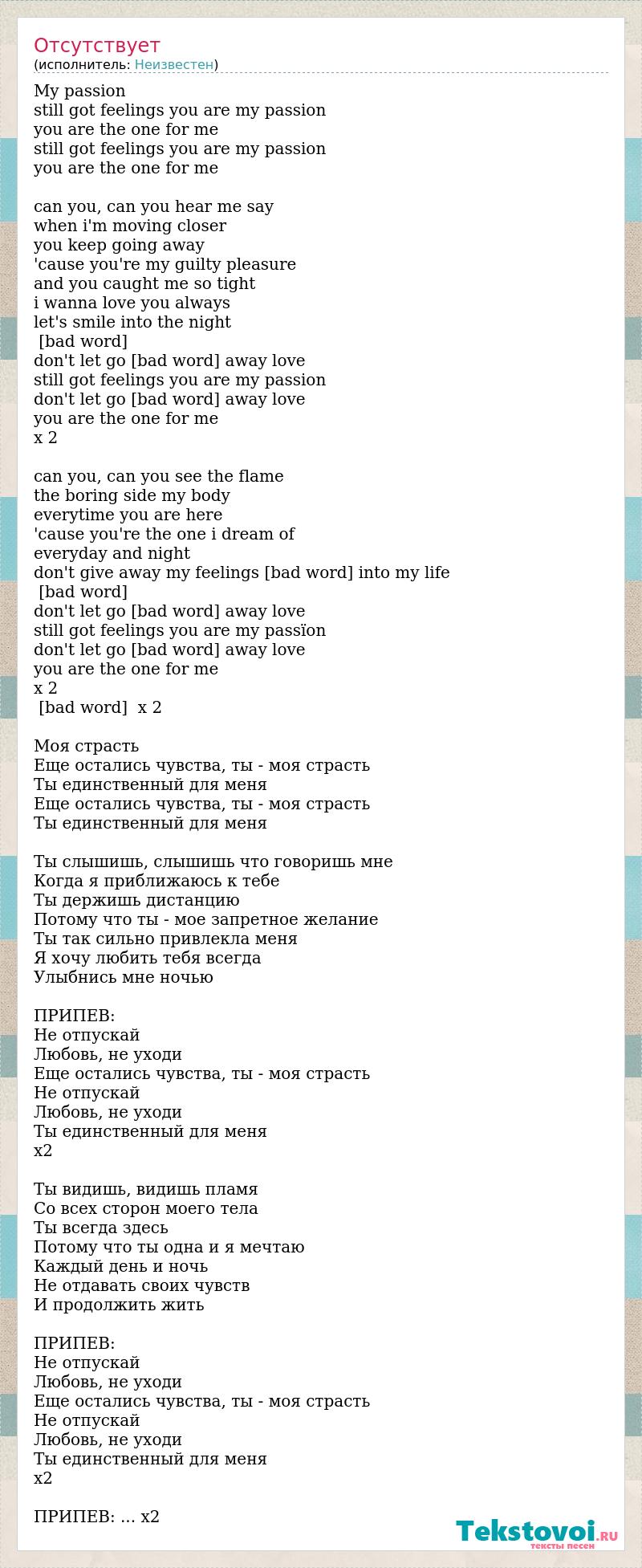 My passion still got feelings you are my passion you are the one for me still got feelings you are my passion you are the one for me can you, can you hear me say when i'm moving closer you keep going away 'cause you're my guilty pleasure and you caught me so tight i wanna love you always let's smile into the night [bad word] don't let go [bad word] away love still got feelings you are my passion don't let go [bad word] away love you are the one for me x 2 can you, can you see the flame the boring side my body everytime you are here 'cause you're the one i dream of everyday and night don't give away my feelings [bad word] into my life [bad word] don't let go [bad word] away love still got feelings you are my passïon don't let go [bad word] away love you are the one for me x 2 [bad word] x 2 Моя страсть Еще остались чувства, ты - моя страсть Ты единственный для меня Еще остались чувства, ты - моя страсть Ты единственный для меня Ты слышишь, слышишь что говоришь мне Когда я приближаюсь к тебе Ты держишь дистанцию Потому что ты - мое запретное желание Ты так сильно привлекла меня Я хочу любить тебя всегда Улыбнись мне ночью ПРИПЕВ: Не отпускай Любовь, не уходи Еще остались чувства, ты - моя страсть Не отпускай Любовь, не уходи Ты единственный для меня х2 Ты видишь, видишь пламя Со всех сторон моего тела Ты всегда здесь Потому что ты одна и я мечтаю Каждый день и ночь Не отдавать своих чувств И продолжить жить ПРИПЕВ: Не отпускай Любовь, не уходи Еще остались чувства, ты - моя страсть Не отпускай Любовь, не уходи Ты единственный для меня х2 ПРИПЕВ: ... х2