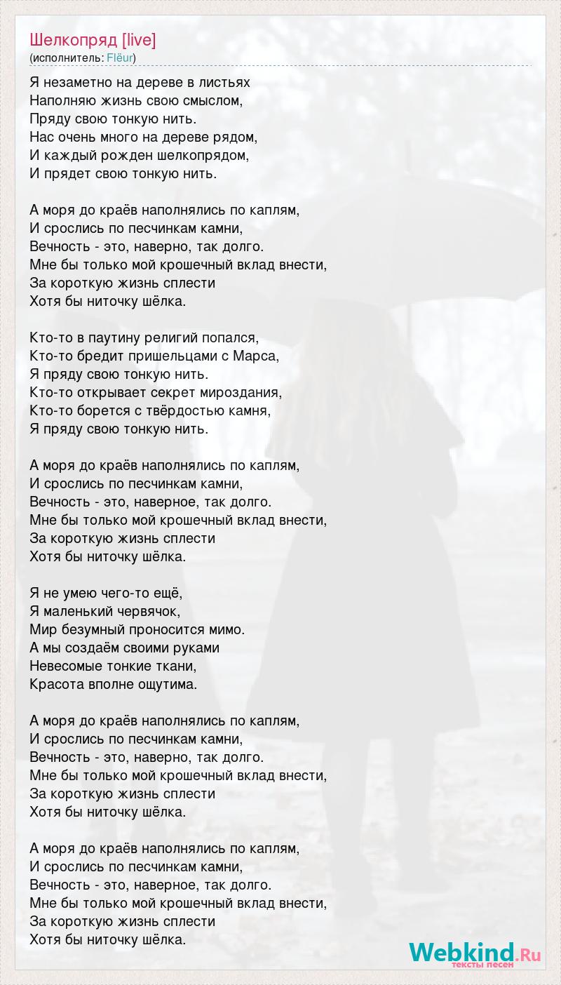 Я незаметно на дереве в листьях Наполняю жизнь свою смыслом, Пряду свою тонкую нить. Нас очень много на дереве рядом, И каждый рожден шелкопрядом, И прядет свою тонкую нить. А моря до краёв наполнялись по каплям, И срослись по песчинкам камни, Вечность - это, наверно, так долго. Мне бы только мой крошечный вклад внести, За короткую жизнь сплести Хотя бы ниточку шёлка. Кто-то в паутину религий попался, Кто-то бредит пришельцами с Марса, Я пряду свою тонкую нить. Кто-то открывает секрет мироздания, Кто-то борется с твёрдостью камня, Я пряду свою тонкую нить. А моря до краёв наполнялись по каплям, И срослись по песчинкам камни, Вечность - это, наверное, так долго. Мне бы только мой крошечный вклад внести, За короткую жизнь сплести Хотя бы ниточку шёлка. Я не умею чего-то ещё, Я маленький червячок, Мир безумный проносится мимо. А мы создаём своими руками Невесомые тонкие ткани, Красота вполне ощутима. А моря до краёв наполнялись по каплям, И срослись по песчинкам камни, Вечность - это, наверно, так долго. Мне бы только мой крошечный вклад внести, За короткую жизнь сплести Хотя бы ниточку шёлка. А моря до краёв наполнялись по каплям, И срослись по песчинкам камни, Вечность - это, наверное, так долго. Мне бы только мой крошечный вклад внести, За короткую жизнь сплести Хотя бы ниточку шёлка.