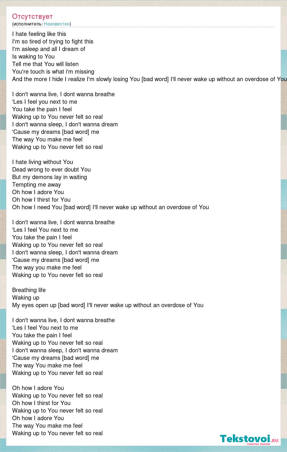 I hate feeling like this I'm so tired of trying to fight this I'm asleep and all I dream of Is waking to You Tell me that You will listen You're touch is what i'm missing And the more I hide I realize I'm slowly losing You [bad word] I'll never wake up without an overdose of You I don't wanna live, I dont wanna breathe 'Les I feel you next to me You take the pain I feel Waking up to You never felt so real I don't wanna sleep, I don't wanna dream 'Cause my dreams [bad word] me The way You make me feel Waking up to You never felt so real I hate living without You Dead wrong to ever doubt You But my demons lay in waiting Tempting me away Oh how I adore You Oh how I thirst for You Oh how I need You [bad word] I'll never wake up without an overdose of You I don't wanna live, I dont wanna breathe 'Les I feel You next to me You take the pain I feel Waking up to You never felt so real I don't wanna sleep, I don't wanna dream 'Cause my dreams [bad word] me The way you make me feel Waking up to You never felt so real Breathing life Waking up My eyes open up [bad word] I'll never wake up without an overdose of You I don't wanna live, I dont wanna breathe 'Les I feel You next to me You take the pain I feel Waking up to You never felt so real I don't wanna sleep, I don't wanna dream 'Cause my dreams [bad word] me The way You make me feel Waking up to You never felt so real Oh how I adore You Waking up to You never felt so real Oh how I thirst for You Waking up to You never felt so real Oh how I adore You The way You make me feel Waking up to You never felt so real