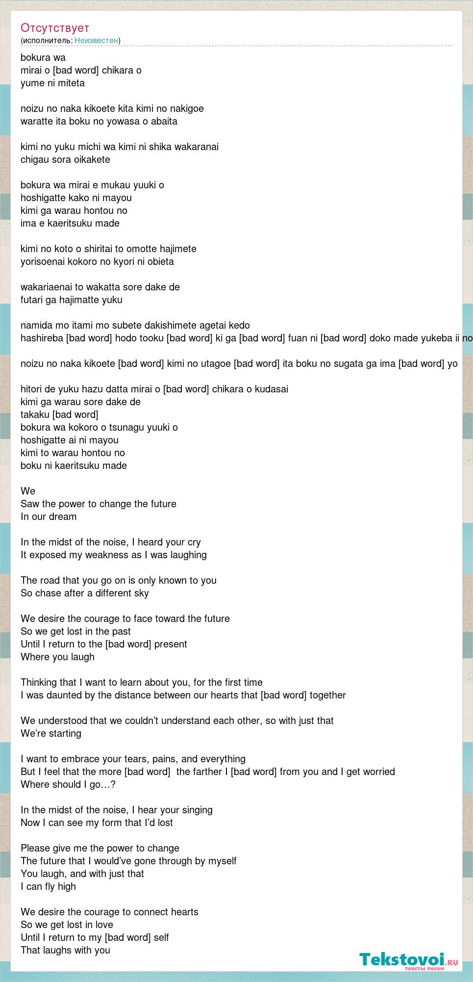 bokura wa mirai o [bad word] chikara o yume ni miteta noizu no naka kikoete kita kimi no nakigoe waratte ita boku no yowasa o abaita kimi no yuku michi wa kimi ni shika wakaranai chigau sora oikakete bokura wa mirai e mukau yuuki o hoshigatte kako ni mayou kimi ga warau hontou no ima e kaeritsuku made kimi no koto o shiritai to omotte hajimete yorisoenai kokoro no kyori ni obieta wakariaenai to wakatta sore dake de futari ga hajimatte yuku namida mo itami mo subete dakishimete agetai kedo hashireba [bad word] hodo tooku [bad word] ki ga [bad word] fuan ni [bad word] doko made yukeba ii no noizu no naka kikoete [bad word] kimi no utagoe [bad word] ita boku no sugata ga ima [bad word] yo hitori de yuku hazu datta mirai o [bad word] chikara o kudasai kimi ga warau sore dake de takaku [bad word] bokura wa kokoro o tsunagu yuuki o hoshigatte ai ni mayou kimi to warau hontou no boku ni kaeritsuku made We Saw the power to change the future In our dream In the midst of the noise, I heard your cry It exposed my weakness as I was laughing The road that you go on is only known to you So chase after a different sky We desire the courage to face toward the future So we get lost in the past Until I return to the [bad word] present Where you laugh Thinking that I want to learn about you, for the first time I was daunted by the distance between our hearts that [bad word] together We understood that we couldn’t understand each other, so with just that We’re starting I want to embrace your tears, pains, and everything But I feel that the more [bad word] the farther I [bad word] from you and I get worried Where should I go…? In the midst of the noise, I hear your singing Now I can see my form that I’d lost Please give me the power to change The future that I would’ve gone through by myself You laugh, and with just that I can fly high We desire the courage to connect hearts So we get lost in love Until I return to my [bad word] self That laughs with you