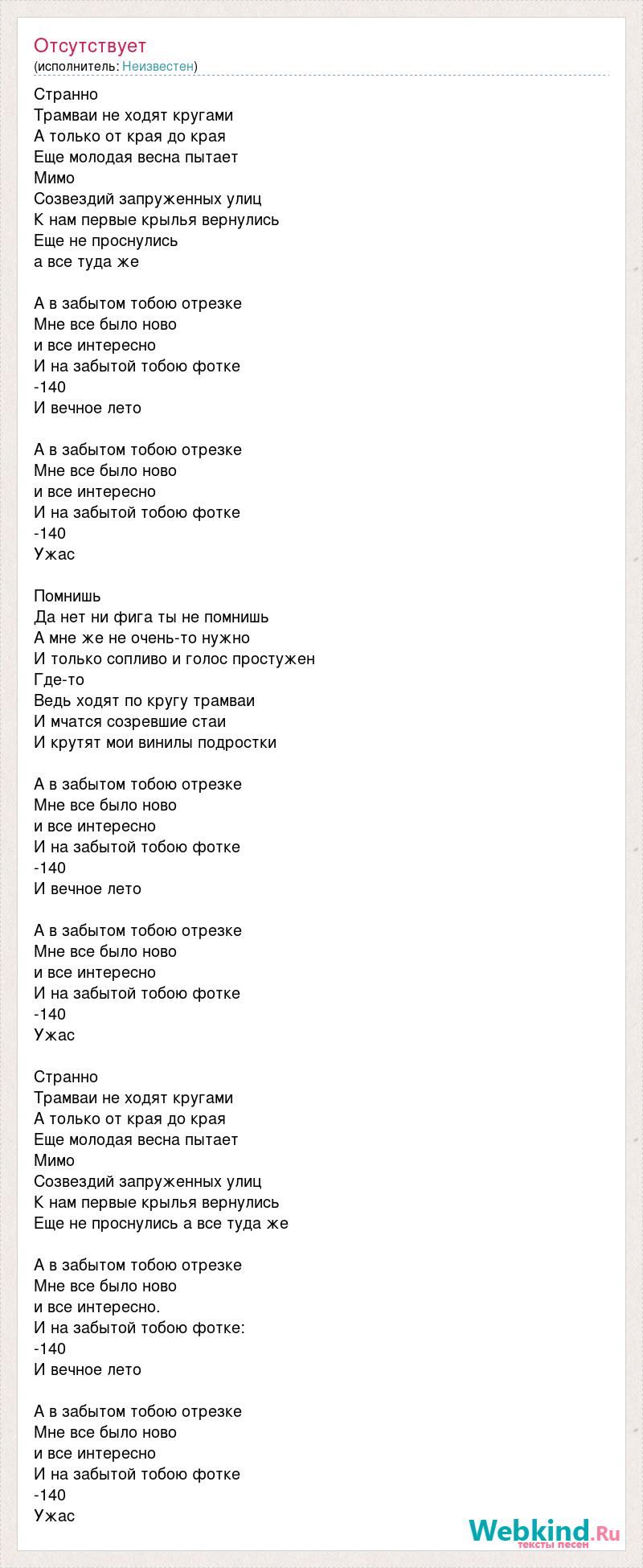 Странно Трамваи не ходят кругами А только от края до края Еще молодая весна пытает Мимо Созвездий запруженных улиц К нам первые крылья вернулись Еще не проснулись а все туда же А в забытом тобою отрезке Мне все было ново и все интересно И на забытой тобою фотке -140 И вечное лето А в забытом тобою отрезке Мне все было ново и все интересно И на забытой тобою фотке -140 Ужас Помнишь Да нет ни фига ты не помнишь А мне же не очень-то нужно И только сопливо и голос простужен Где-то Ведь ходят по кругу трамваи И мчатся созревшие стаи И крутят мои винилы подростки А в забытом тобою отрезке Мне все было ново и все интересно И на забытой тобою фотке -140 И вечное лето А в забытом тобою отрезке Мне все было ново и все интересно И на забытой тобою фотке -140 Ужас Странно Трамваи не ходят кругами А только от края до края Еще молодая весна пытает Мимо Созвездий запруженных улиц К нам первые крылья вернулись Еще не проснулись а все туда же А в забытом тобою отрезке Мне все было ново и все интересно. И на забытой тобою фотке: -140 И вечное лето А в забытом тобою отрезке Мне все было ново и все интересно И на забытой тобою фотке -140 Ужас