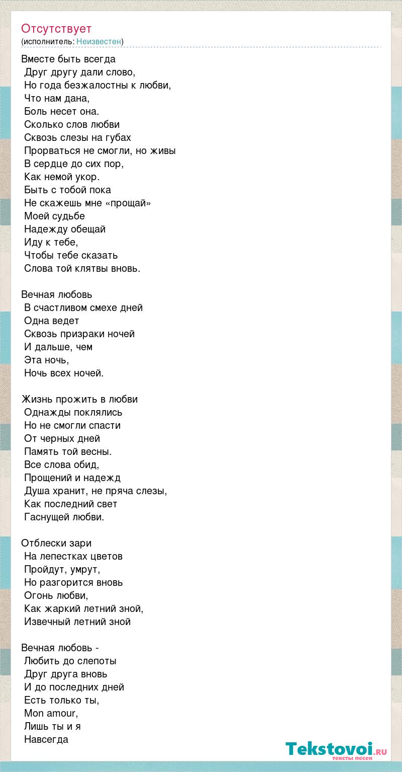 Вместе быть всегда Друг другу дали слово, Но года безжалостны к любви, Что нам дана, Боль несет она. Сколько слов любви Сквозь слезы на губах Прорваться не смогли, но живы В сердце до сих пор, Как немой укор. Быть с тобой пока Не скажешь мне «прощай» Моей судьбе Надежду обещай Иду к тебе, Чтобы тебе сказать Слова той клятвы вновь. Вечная любовь В счастливом смехе дней Одна ведет Сквозь призраки ночей И дальше, чем Эта ночь, Ночь всех ночей. Жизнь прожить в любви Однажды поклялись Но не смогли спасти От черных дней Память той весны. Все слова обид, Прощений и надежд Душа хранит, не пряча слезы, Как последний свет Гаснущей любви. Отблески зари На лепестках цветов Пройдут, умрут, Но разгорится вновь Огонь любви, Как жаркий летний зной, Извечный летний зной Вечная любовь - Любить до слепоты Друг друга вновь И до последних дней Есть только ты, Mon amour, Лишь ты и я Навсегда