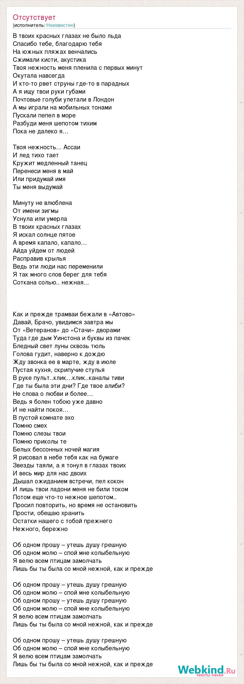 В твоих красных глазах не было льда Спасибо тебе, благодарю тебя На южных пляжах венчались Сжимали кисти, акустика Твоя нежность меня пленила с первых минут Окутала навсегда И кто-то рвет струны где-то в парадных А я ищу твои руки губами Почтовые голуби улетали в Лондон А мы играли на мобильных тонами Пускали пепел в море Разбуди меня шепотом тихим Пока не далеко я… Твоя нежность... Ассаи И лед тихо тает Кружит медленный танец Перенеси меня в май Или придумай имя Ты меня выдумай Минуту не влюблена От имени зигмы Уснула или умерла В твоих красных глазах Я искал солнце пятое А время капало, капало… Айда уйдем от людей Расправив крылья Ведь эти люди нас переменили Я так много слов берег для тебя Соткана солью.. нежная... Как и прежде трамваи бежали в «Автово» Давай, Брачо, увидимся завтра мы От «Ветеранов» до «Стачи» дворами Туда где дым Уинстона и буквы из пачек Бледный свет луны сквозь тюль Голова гудит, наверно к дождю Жду звонка ее в марте, жду в июле Пустая кухня, скрипучие стулья В руке пульт..клик…клик..каналы тиви Где ты была эти дни? Где твое алиби? Не слова о любви и более… Ведь я болен тобою уже давно И не найти покоя… В пустой комнате эхо Помню смех Помню слезы твои Помню приколы те Белых бессонных ночей магия Я рисовал в небе тебя как на бумаге Звезды таяли, а я тонул в глазах твоих И весь мир для нас двоих Дышал ожиданием встречи, пел кокон И лишь твои ладони меня не били током Потом еще что-то нежное шепотом.. Просил повторить, но время не остановить Прости, обещаю хранить Остатки нашего с тобой прежнего Нежного, бережно Об одном прошу – утешь душу грешную Об одном молю – спой мне колыбельную Я велю всем птицам замолчать Лишь бы ты была со мной нежной, как и прежде Об одном прошу – утешь душу грешную Об одном молю – спой мне колыбельную Об одном прошу – утешь душу грешную Об одном молю – спой мне колыбельную Я велю всем птицам замолчать Лишь бы ты была со мной нежной, как и прежде Об одном прошу – утешь душу грешную Об одном молю – спой мне колыбельную Я велю всем птицам замолчать Лишь бы ты была со мной нежной, как и прежде