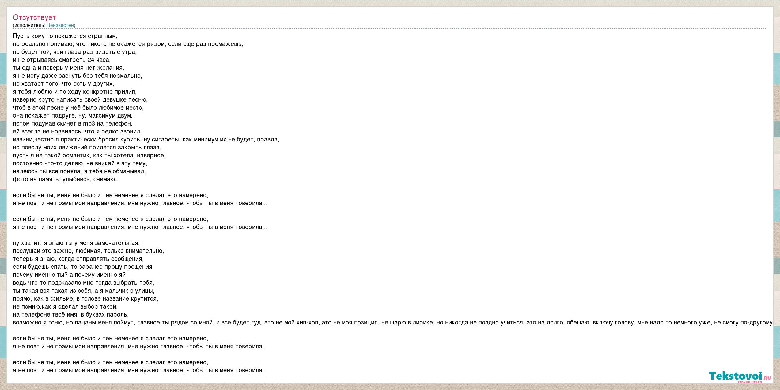 Пусть кому то покажется странным, но реально понимаю, что никого не окажется рядом, если еще раз промажешь, не будет той, чьи глаза рад видеть с утра, и не отрываясь смотреть 24 часа, ты одна и поверь у меня нет желания, я не могу даже заснуть без тебя нормально, не хватает того, что есть у других, я тебя люблю и по ходу конкретно прилип, наверно круто написать своей девушке песню, чтоб в этой песне у неё было любимое место, она покажет подруге, ну, максимум двум, потом подумав скинет в mp3 на телефон, ей всегда не нравилось, что я редко звонил, извини,честно я практически бросил курить, ну сигареты, как минимум их не будет, правда, но поводу моих движений придётся закрыть глаза, пусть я не такой романтик, как ты хотела, наверное, постоянно что-то делаю, не вникай в эту тему, надеюсь ты всё поняла, я тебя не обманывал, фото на память: улыбнись, снимаю.. если бы не ты, меня не было и тем неменее я сделал это намерено, я не поэт и не поэмы мои направления, мне нужно главное, чтобы ты в меня поверила... если бы не ты, меня не было и тем неменее я сделал это намерено, я не поэт и не поэмы мои направления, мне нужно главное, чтобы ты в меня поверила... ну хватит, я знаю ты у меня замечательная, послушай это важно, любимая, только внимательно, теперь я знаю, когда отправлять сообщения, если будешь спать, то заранее прошу прощения. почему именно ты? а почему именно я? ведь что-то подсказало мне тогда выбрать тебя, ты такая вся такая из себя, а я мальчик с улицы, прямо, как в фильме, в голове название крутится, не помню,как я сделал выбор такой, на телефоне твоё имя, в буквах пароль, возможно я гоню, но пацаны меня поймут, главное ты рядом со мной, и все будет гуд, это не мой хип-хоп, это не моя позиция, не шарю в лирике, но никогда не поздно учиться, это на долго, обещаю, включу голову, мне надо то немного уже, не смогу по-другому.. если бы не ты, меня не было и тем неменее я сделал это намерено, я не поэт и не поэмы мои направления, мне нужно главное, чтобы ты в меня поверила... если бы не ты, меня не было и тем неменее я сделал это намерено, я не поэт и не поэмы мои направления, мне нужно главное, чтобы ты в меня поверила...