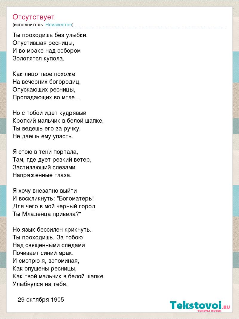 Ты проходишь без улыбки, Опустившая ресницы, И во мраке над собором Золотятся купола. Как лицо твое похоже На вечерних богородиц, Опускающих ресницы, Пропадающих во мгле... Но с тобой идет кудрявый Кроткий мальчик в белой шапке, Ты ведешь его за ручку, Не даешь ему упасть. Я стою в тени портала, Там, где дует резкий ветер, Застилающий слезами Напряженные глаза. Я хочу внезапно выйти И воскликнуть: "Богоматерь! Для чего в мой черный город Ты Младенца привела?" Но язык бессилен крикнуть. Ты проходишь. За тобою Над священными следами Почивает синий мрак. И смотрю я, вспоминая, Как опущены ресницы, Как твой мальчик в белой шапке Улыбнулся на тебя. 29 октября 1905