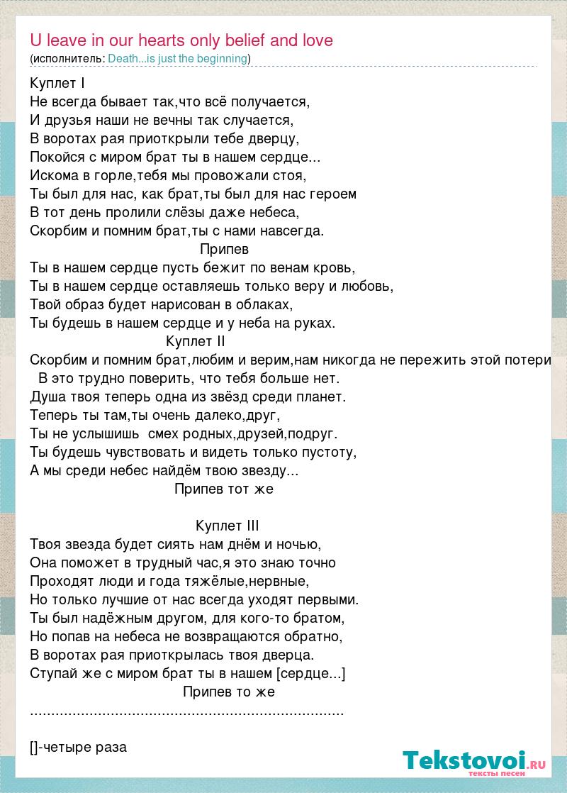 Куплет I Не всегда бывает так,что всё получается, И друзья наши не вечны так случается, В воротах рая приоткрыли тебе дверцу, Покойся с миром брат ты в нашем сердце... Искома в горле,тебя мы провожали стоя, Ты был для нас, как брат,ты был для нас героем В тот день пролили слёзы даже небеса, Скорбим и помним брат,ты с нами навсегда. Припев Ты в нашем сердце пусть бежит по венам кровь, Ты в нашем сердце оставляешь только веру и любовь, Твой образ будет нарисован в облаках, Ты будешь в нашем сердце и у неба на руках. Куплет II Скорбим и помним брат,любим и верим,нам никогда не пережить этой потери В это трудно поверить, что тебя больше нет. Душа твоя теперь одна из звёзд среди планет. Теперь ты там,ты очень далеко,друг, Ты не услышишь смех родных,друзей,подруг. Ты будешь чувствовать и видеть только пустоту, А мы среди небес найдём твою звезду... Припев тот же Куплет III Твоя звезда будет сиять нам днём и ночью, Она поможет в трудный час,я это знаю точно Проходят люди и года тяжёлые,нервные, Но только лучшие от нас всегда уходят первыми. Ты был надёжным другом, для кого-то братом, Но попав на небеса не возвращаются обратно, В воротах рая приоткрылась твоя дверца. Ступай же с миром брат ты в нашем [сердце...] Припев то же .......................................................................... []-четыре раза