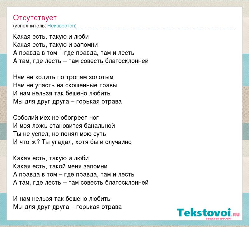 Какая есть, такую и люби Какая есть, такую и запомни А правда в том – где правда, там и лесть А там, где лесть – там совесть благосклонней Нам не ходить по тропам золотым Нам не упасть на скошенные травы И нам нельзя так бешено любить Мы для друг друга – горькая отрава Соболий мех не обогреет ног И моя ложь становится банальной Ты не успел, но понял мою суть И что ж? Ты угадал, хотя бы и случайно Какая есть, такую и люби Какая есть, такой меня запомни А правда в том – где правда, там и лесть А там, где лесть – там совесть благосклонней И нам нельзя так бешено любить Мы для друг друга – горькая отрава