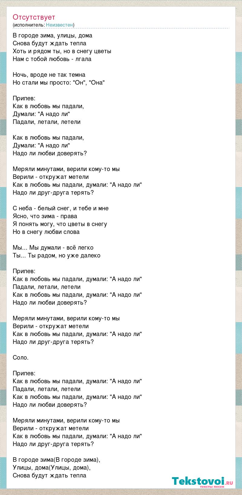 В городе зима, улицы, дома Снова будут ждать тепла Хоть и рядом ты, но в снегу цветы Нам с тобой любовь - лгала Ночь, вроде не так темна Но стали мы просто: "Он", "Она" Припев: Как в любовь мы падали, Думали: "А надо ли" Падали, летали, летели Как в любовь мы падали, Думали: "А надо ли" Надо ли любви доверять? Меряли минутами, верили кому-то мы Верили - откружат метели Как в любовь мы падали, думали: "А надо ли" Надо ли друг-друга терять? С неба - белый снег, и тебе и мне Ясно, что зима - права Я понять могу, что цветы в снегу Но в снегу любви слова Мы... Мы думали - всё легко Ты... Ты радом, но уже далеко Припев: Как в любовь мы падали, думали: "А надо ли" Падали, летали, летели Как в любовь мы падали, думали: "А надо ли" Надо ли любви доверять? Меряли минутами, верили кому-то мы Верили - откружат метели Как в любовь мы падали, думали: "А надо ли" Надо ли друг-друга терять? Соло. Припев: Как в любовь мы падали, думали: "А надо ли" Падали, летали, летели Как в любовь мы падали, думали: "А надо ли" Надо ли любви доверять? Меряли минутами, верили кому-то мы Верили - откружат метели Как в любовь мы падали, думали: "А надо ли" Надо ли друг-друга терять? В городе зима(В городе зима), Улицы, дома(Улицы, дома), Снова будут ждать тепла