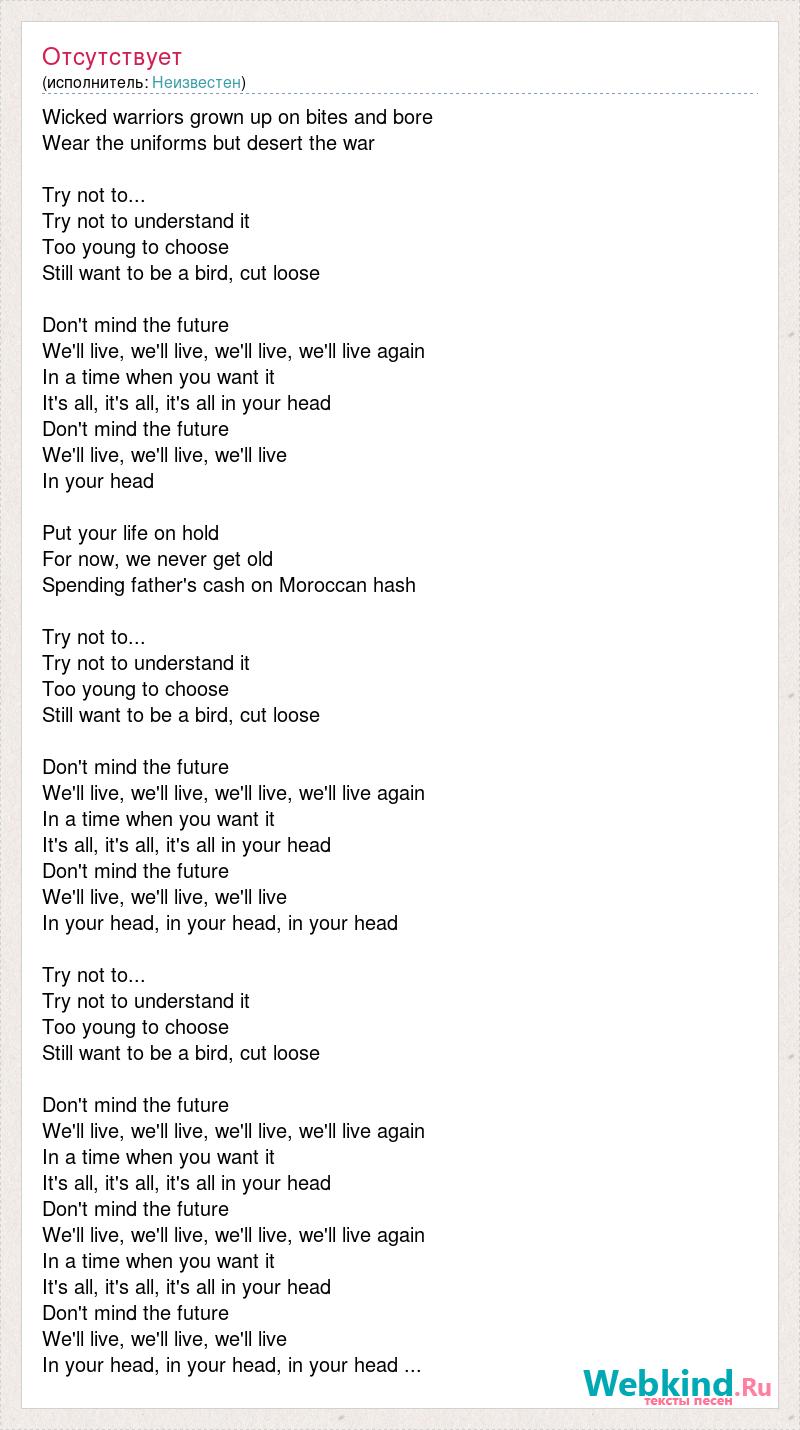 Wicked warriors grown up on bites and bore Wear the uniforms but desert the war Try not to... Try not to understand it Too young to choose Still want to be a bird, cut loose Don't mind the future We'll live, we'll live, we'll live, we'll live again In a time when you want it It's all, it's all, it's all in your head Don't mind the future We'll live, we'll live, we'll live In your head Put your life on hold For now, we never get old Spending father's cash on Moroccan hash Try not to... Try not to understand it Too young to choose Still want to be a bird, cut loose Don't mind the future We'll live, we'll live, we'll live, we'll live again In a time when you want it It's all, it's all, it's all in your head Don't mind the future We'll live, we'll live, we'll live In your head, in your head, in your head Try not to... Try not to understand it Too young to choose Still want to be a bird, cut loose Don't mind the future We'll live, we'll live, we'll live, we'll live again In a time when you want it It's all, it's all, it's all in your head Don't mind the future We'll live, we'll live, we'll live, we'll live again In a time when you want it It's all, it's all, it's all in your head Don't mind the future We'll live, we'll live, we'll live In your head, in your head, in your head ...