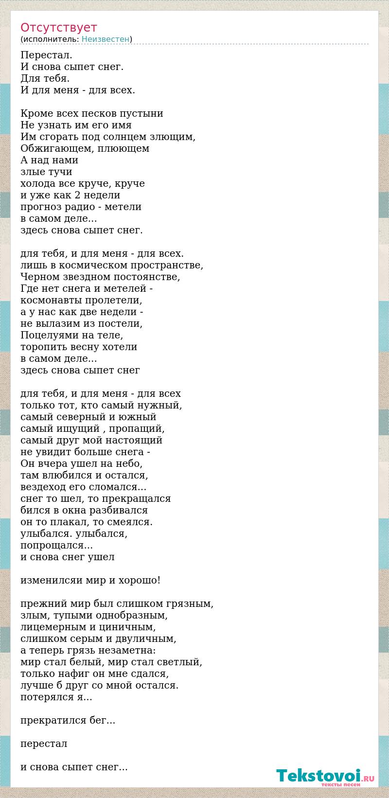 Перестал. И снова сыпет снег. Для тебя. И для меня - для всех. Кроме всех песков пустыни Не узнать им его имя Им сгорать под солнцем злющим, Обжигающем, плюющем А над нами злые тучи холода все круче, круче и уже как 2 недели прогноз радио - метели в самом деле... здесь снова сыпет снег. для тебя, и для меня - для всех. лишь в космическом пространстве, Черном звездном постоянстве, Где нет снега и метелей - космонавты пролетели, а у нас как две недели - не вылазим из постели, Поцелуями на теле, торопить весну хотели в самом деле... здесь снова сыпет снег для тебя, и для меня - для всех только тот, кто самый нужный, самый северный и южный самый ищущий , пропащий, самый друг мой настоящий не увидит больше снега - Он вчера ушел на небо, там влюбился и остался, вездеход его сломался... снег то шел, то прекращался бился в окна разбивался он то плакал, то смеялся. улыбался. улыбался, попрощался... и снова снег ушел изменилсяи мир и хорошо! прежний мир был слишком грязным, злым, тупыми однобразным, лицемерным и циничным, слишком серым и двуличным, а теперь грязь незаметна: мир стал белый, мир стал светлый, только нафиг он мне сдался, лучше б друг со мной остался. потерялся я... прекратился бег... перестал и снова сыпет снег...