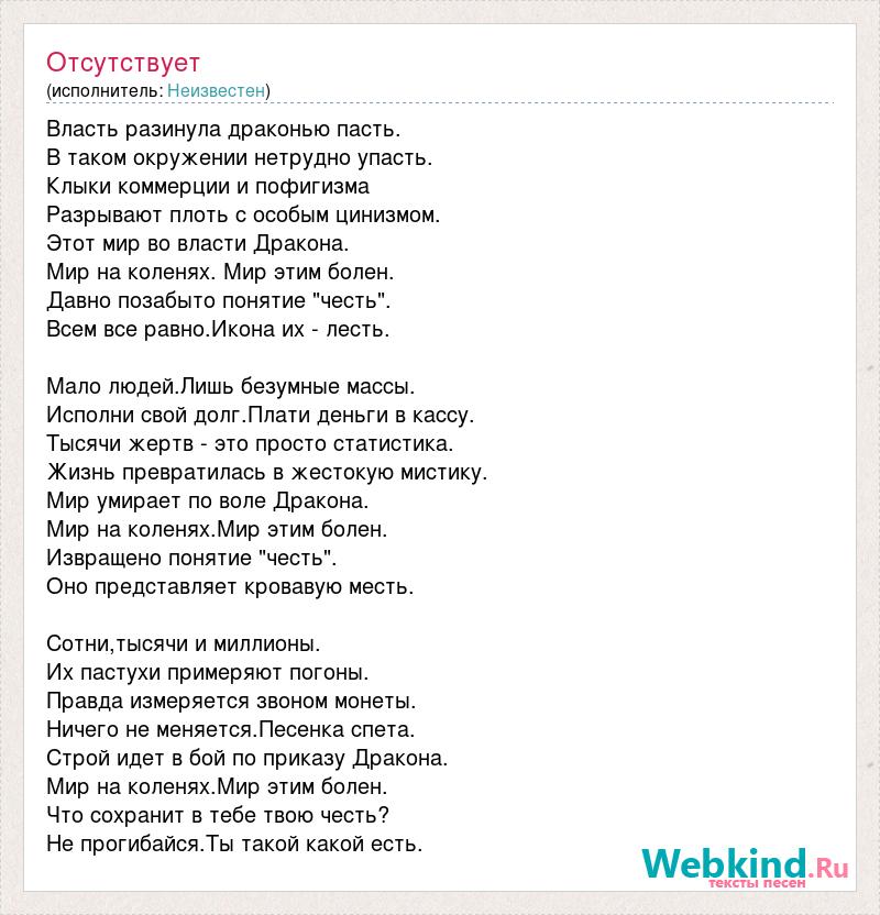 Власть разинула драконью пасть. В таком окружении нетрудно упасть. Клыки коммерции и пофигизма Разрывают плоть с особым цинизмом. Этот мир во власти Дракона. Мир на коленях. Мир этим болен. Давно позабыто понятие "честь". Всем все равно.Икона их - лесть. Мало людей.Лишь безумные массы. Исполни свой долг.Плати деньги в кассу. Тысячи жертв - это просто статистика. Жизнь превратилась в жестокую мистику. Мир умирает по воле Дракона. Мир на коленях.Мир этим болен. Извращено понятие "честь". Оно представляет кровавую месть. Сотни,тысячи и миллионы. Их пастухи примеряют погоны. Правда измеряется звоном монеты. Ничего не меняется.Песенка спета. Строй идет в бой по приказу Дракона. Мир на коленях.Мир этим болен. Что сохранит в тебе твою честь? Не прогибайся.Ты такой какой есть.