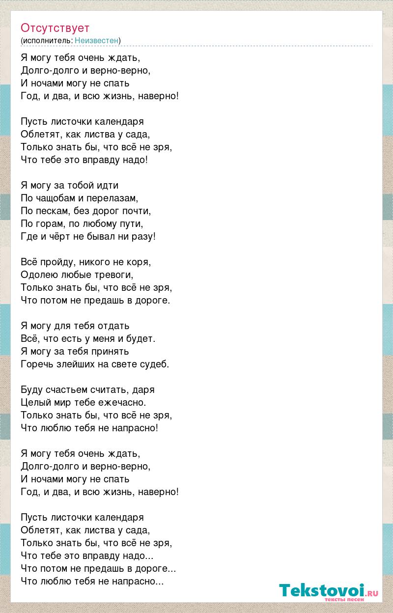 Я могу тебя очень ждать, Долго-долго и верно-верно, И ночами могу не спать Год, и два, и всю жизнь, наверно! Пусть листочки календаря Облетят, как листва у сада, Только знать бы, что всё не зря, Что тебе это вправду надо! Я могу за тобой идти По чащобам и перелазам, По пескам, без дорог почти, По горам, по любому пути, Где и чёрт не бывал ни разу! Всё пройду, никого не коря, Одолею любые тревоги, Только знать бы, что всё не зря, Что потом не предашь в дороге. Я могу для тебя отдать Всё, что есть у меня и будет. Я могу за тебя принять Горечь злейших на свете судеб. Буду счастьем считать, даря Целый мир тебе ежечасно. Только знать бы, что всё не зря, Что люблю тебя не напрасно! Я могу тебя очень ждать, Долго-долго и верно-верно, И ночами могу не спать Год, и два, и всю жизнь, наверно! Пусть листочки календаря Облетят, как листва у сада, Только знать бы, что всё не зря, Что тебе это вправду надо... Что потом не предашь в дороге... Что люблю тебя не напрасно...