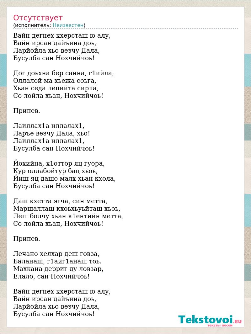 Вайн дегнех кхерсташ ю алу, Вайн ирсан дайъина доь, Ларйойла хьо везчу Дала, Бусулба сан Нохчийчоь! Дог доьхна бер санна, г1ийла, Оллалой ма хьежа соьга, Хьан седа лепийта сирла, Со лойла хьан, Нохчийчоь! Припев. Лаиллах1а иллалах1, Ларъе везчу Дала, хьо! Лаиллах1а иллалах1, Бусулба сан Нохчийчоь! Йохийна, х1оттор яц гуора, Кур оллабойтур бац хьоь, Йиш яц дашо малх хьан кхола, Бусулба сан Нохчийчоь! Даш кхетта эгча, син метта, Маршаллаш кхоьхьуьйташ хьоь, Леш болчу хьан к1ентийн метта, Со лойла хьан, Нохчийчоь! Припев. Лечано хелхар деш говза, Баланаш, г1айг1анаш тоь. Махкана дерриг ду ловзар, Елало, сан Нохчийчоь! Вайн дегнех кхерсташ ю алу, Вайн ирсан дайъина доь, Ларйойла хьо везчу Дала, Бусулба сан Нохчийчоь!