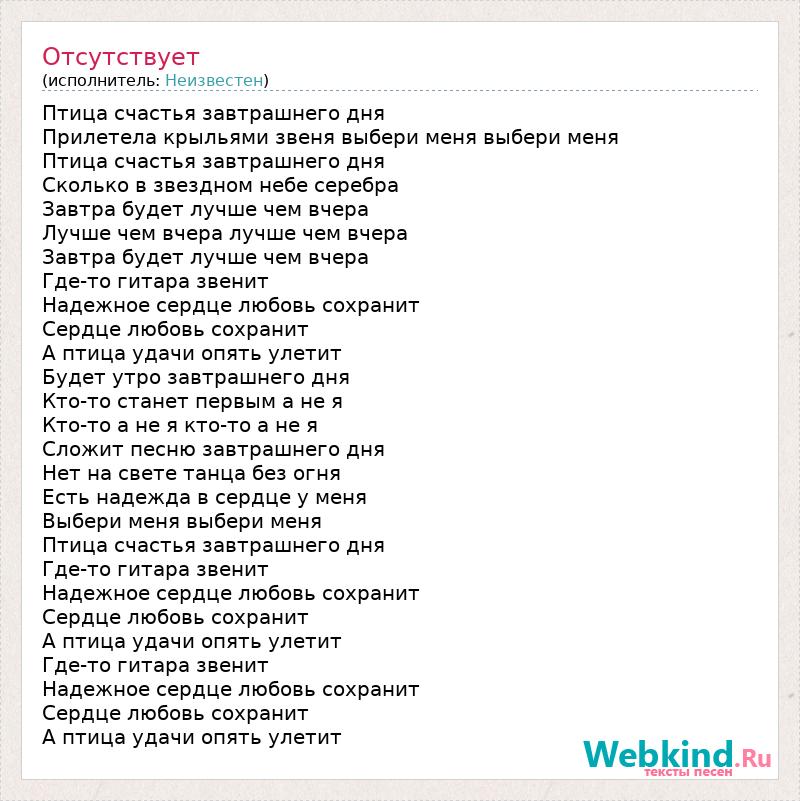 Птица счастья завтрашнего дня Прилетела крыльями звеня выбери меня выбери меня Птица счастья завтрашнего дня Сколько в звездном небе серебра Завтра будет лучше чем вчера Лучше чем вчера лучше чем вчера Завтра будет лучше чем вчера Где-то гитара звенит Надежное сердце любовь сохранит Сердце любовь сохранит А птица удачи опять улетит Будет утро завтрашнего дня Кто-то станет первым а не я Кто-то а не я кто-то а не я Сложит песню завтрашнего дня Нет на свете танца без огня Есть надежда в сердце у меня Выбери меня выбери меня Птица счастья завтрашнего дня Где-то гитара звенит Надежное сердце любовь сохранит Сердце любовь сохранит А птица удачи опять улетит Где-то гитара звенит Надежное сердце любовь сохранит Сердце любовь сохранит А птица удачи опять улетит