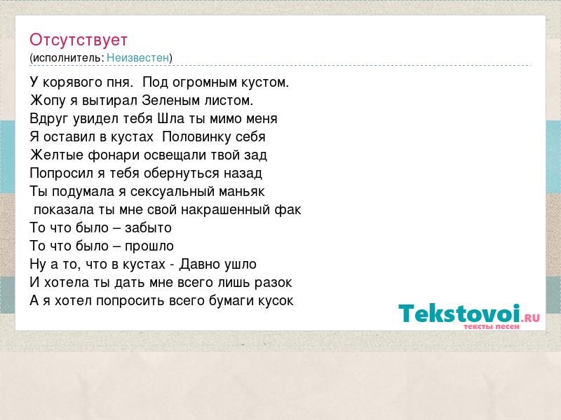У корявого пня. Под огромным кустом. Жопу я вытирал Зеленым листом. Вдруг увидел тебя Шла ты мимо меня Я оставил в кустах Половинку себя Желтые фонари освещали твой зад Попросил я тебя обернуться назад Ты подумала я сексуальный маньяк показала ты мне свой накрашенный фак То что было – забыто То что было – прошло Ну а то, что в кустах - Давно ушло И хотела ты дать мне всего лишь разок А я хотел попросить всего бумаги кусок