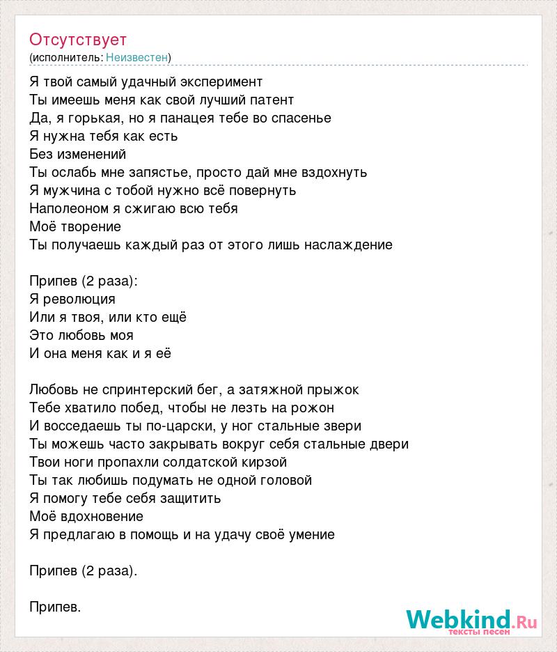 Я твой самый удачный эксперимент Ты имеешь меня как свой лучший патент Да, я горькая, но я панацея тебе во спасенье Я нужна тебя как есть Без изменений Ты ослабь мне запястье, просто дай мне вздохнуть Я мужчина с тобой нужно всё повернуть Наполеоном я сжигаю всю тебя Моё творение Ты получаешь каждый раз от этого лишь наслаждение Припев (2 раза): Я революция Или я твоя, или кто ещё Это любовь моя И она меня как и я её Любовь не спринтерский бег, а затяжной прыжок Тебе хватило побед, чтобы не лезть на рожон И восседаешь ты по-царски, у ног стальные звери Ты можешь часто закрывать вокруг себя стальные двери Твои ноги пропахли солдатской кирзой Ты так любишь подумать не одной головой Я помогу тебе себя защитить Моё вдохновение Я предлагаю в помощь и на удачу своё умение Припев (2 раза). Припев.