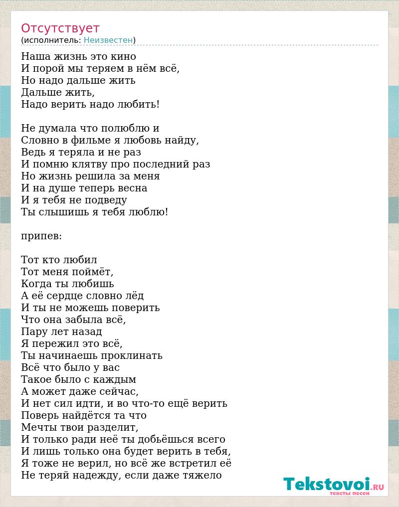 Наша жизнь это кино И порой мы теряем в нём всё, Но надо дальше жить Дальше жить, Надо верить надо любить! Не думала что полюблю и Словно в фильме я любовь найду, Ведь я теряла и не раз И помню клятву про последний раз Но жизнь решила за меня И на душе теперь весна И я тебя не подведу Ты слышишь я тебя люблю! припев: Тот кто любил Тот меня поймёт, Когда ты любишь А её сердце словно лёд И ты не можешь поверить Что она забыла всё, Пару лет назад Я пережил это всё, Ты начинаешь проклинать Всё что было у вас Такое было с каждым А может даже сейчас, И нет сил идти, и во что-то ещё верить Поверь найдётся та что Мечты твои разделит, И только ради неё ты добьёшься всего И лишь только она будет верить в тебя, Я тоже не верил, но всё же встретил её Не теряй надежду, если даже тяжело