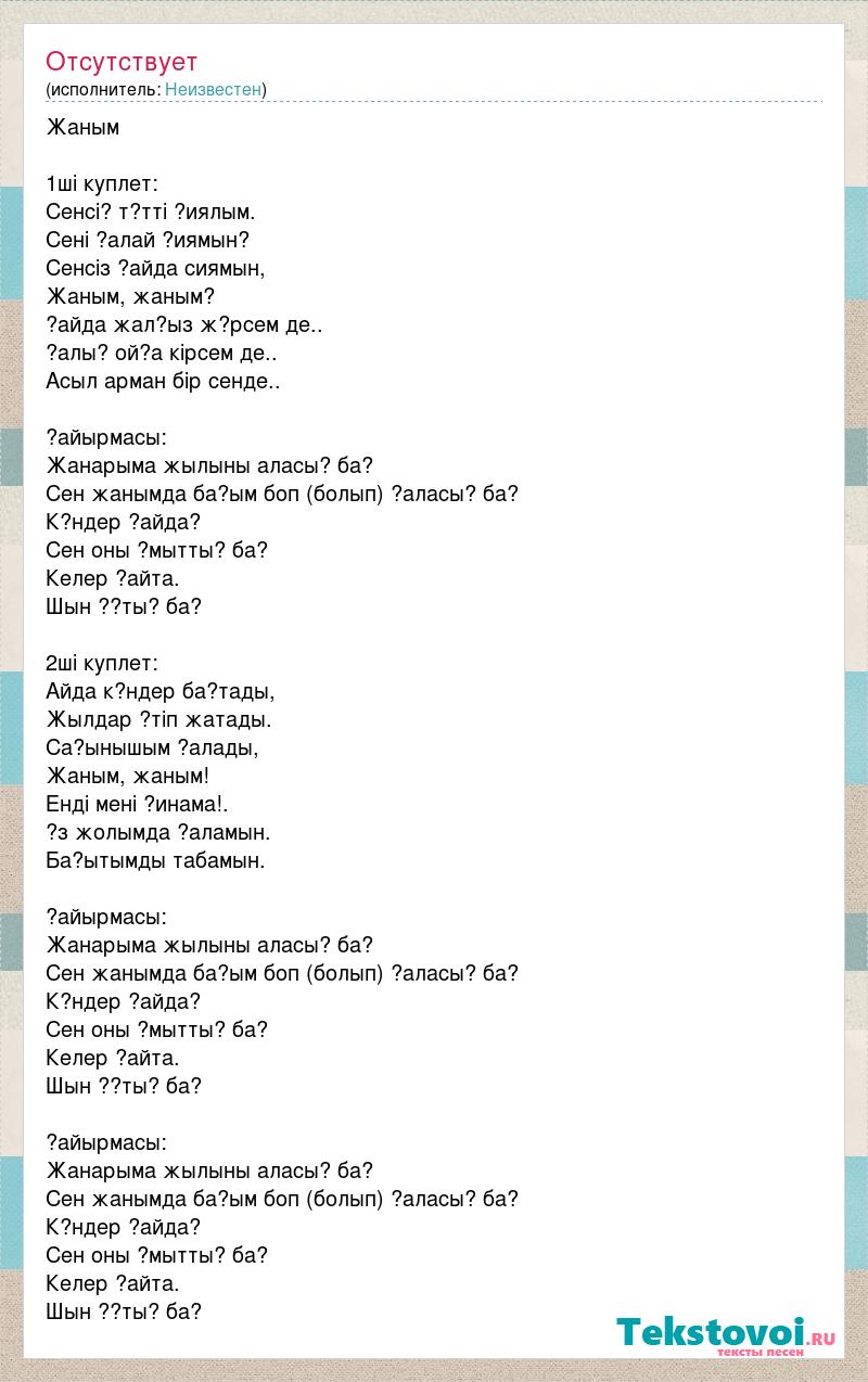 Жаным 1ші куплет: Сенсі? т?тті ?иялым. Сені ?алай ?иямын? Сенсіз ?айда сиямын, Жаным, жаным? ?айда жал?ыз ж?рсем де.. ?алы? ой?а кірсем де.. Асыл арман бір сенде.. ?айырмасы: Жанарыма жылыны аласы? ба? Сен жанымда ба?ым боп (болып) ?аласы? ба? К?ндер ?айда? Сен оны ?мытты? ба? Келер ?айта. Шын ??ты? ба? 2ші куплет: Айда к?ндер ба?тады, Жылдар ?тіп жатады. Са?ынышым ?алады, Жаным, жаным! Енді мені ?инама!. ?з жолымда ?аламын. Ба?ытымды табамын. ?айырмасы: Жанарыма жылыны аласы? ба? Сен жанымда ба?ым боп (болып) ?аласы? ба? К?ндер ?айда? Сен оны ?мытты? ба? Келер ?айта. Шын ??ты? ба? ?айырмасы: Жанарыма жылыны аласы? ба? Сен жанымда ба?ым боп (болып) ?аласы? ба? К?ндер ?айда? Сен оны ?мытты? ба? Келер ?айта. Шын ??ты? ба?