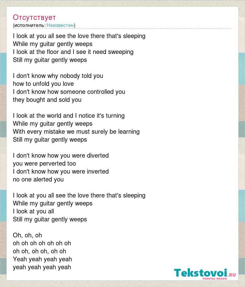 I look at you all see the love there that's sleeping While my guitar gently weeps I look at the floor and I see it need sweeping Still my guitar gently weeps I don't know why nobody told you how to unfold you love I don't know how someone controlled you they bought and sold you I look at the world and I notice it's turning While my guitar gently weeps With every mistake we must surely be learning Still my guitar gently weeps I don't know how you were diverted you were perverted too I don't know how you were inverted no one alerted you I look at you all see the love there that's sleeping While my guitar gently weeps I look at you all Still my guitar gently weeps Oh, oh, oh oh oh oh oh oh oh oh oh oh, oh oh, oh oh Yeah yeah yeah yeah yeah yeah yeah yeah
