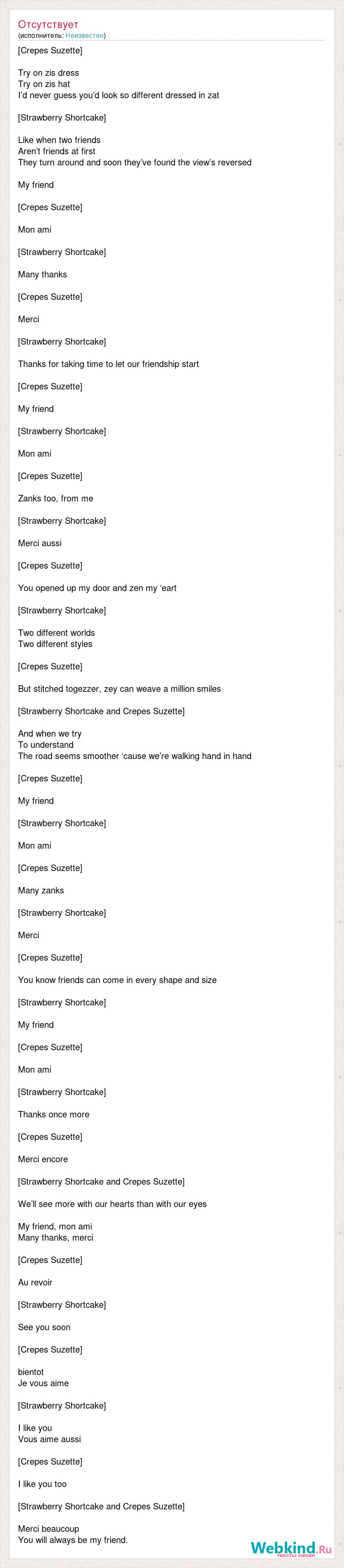 [Crepes Suzette] Try on zis dress Try on zis hat I’d never guess you’d look so different dressed in zat [Strawberry Shortcake] Like when two friends Aren’t friends at first They turn around and soon they’ve found the view’s reversed My friend [Crepes Suzette] Mon ami [Strawberry Shortcake] Many thanks [Crepes Suzette] Merci [Strawberry Shortcake] Thanks for taking time to let our friendship start [Crepes Suzette] My friend [Strawberry Shortcake] Mon ami [Crepes Suzette] Zanks too, from me [Strawberry Shortcake] Merci aussi [Crepes Suzette] You opened up my door and zen my ‘eart [Strawberry Shortcake] Two different worlds Two different styles [Crepes Suzette] But stitched togezzer, zey can weave a million smiles [Strawberry Shortcake and Crepes Suzette] And when we try To understand The road seems smoother ‘cause we’re walking hand in hand [Crepes Suzette] My friend [Strawberry Shortcake] Mon ami [Crepes Suzette] Many zanks [Strawberry Shortcake] Merci [Crepes Suzette] You know friends [bad word] in every shape and size [Strawberry Shortcake] My friend [Crepes Suzette] Mon ami [Strawberry Shortcake] Thanks once more [Crepes Suzette] Merci encore [Strawberry Shortcake and Crepes Suzette] We’ll see more with our hearts than with our eyes My friend, mon ami Many thanks, merci [Crepes Suzette] Au revoir [Strawberry Shortcake] See you soon [Crepes Suzette] bientot Je vous aime [Strawberry Shortcake] I like you Vous aime aussi [Crepes Suzette] I like you too [Strawberry Shortcake and Crepes Suzette] Merci beaucoup You will always be my friend.