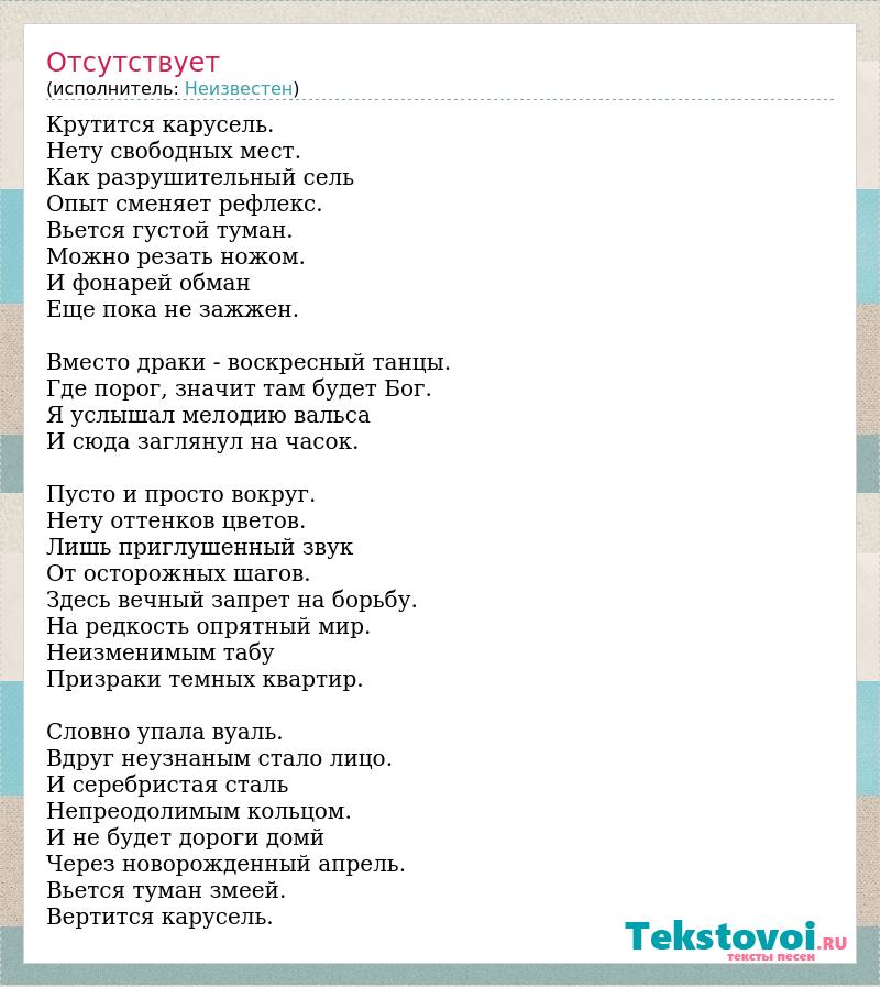 Крутится карусель. Нету свободных мест. Как разрушительный сель Опыт сменяет рефлекс. Вьется густой туман. Можно резать ножом. И фонарей обман Еще пока не зажжен. Вместо драки - воскресный танцы. Где порог, значит там будет Бог. Я услышал мелодию вальса И сюда заглянул на часок. Пусто и просто вокруг. Нету оттенков цветов. Лишь приглушенный звук От осторожных шагов. Здесь вечный запрет на борьбу. На редкость опрятный мир. Неизменимым табу Призраки темных квартир. Словно упала вуаль. Вдруг неузнаным стало лицо. И серебристая сталь Непреодолимым кольцом. И не будет дороги домй Через новорожденный апрель. Вьется туман змеей. Вертится карусель.