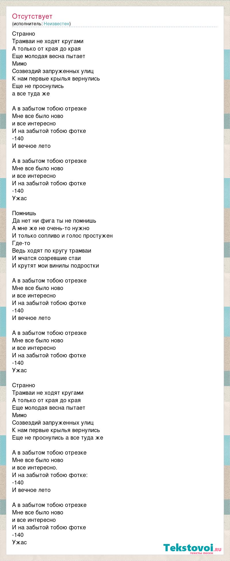Странно Трамваи не ходят кругами А только от края до края Еще молодая весна пытает Мимо Созвездий запруженных улиц К нам первые крылья вернулись Еще не проснулись а все туда же А в забытом тобою отрезке Мне все было ново и все интересно И на забытой тобою фотке -140 И вечное лето А в забытом тобою отрезке Мне все было ново и все интересно И на забытой тобою фотке -140 Ужас Помнишь Да нет ни фига ты не помнишь А мне же не очень-то нужно И только сопливо и голос простужен Где-то Ведь ходят по кругу трамваи И мчатся созревшие стаи И крутят мои винилы подростки А в забытом тобою отрезке Мне все было ново и все интересно И на забытой тобою фотке -140 И вечное лето А в забытом тобою отрезке Мне все было ново и все интересно И на забытой тобою фотке -140 Ужас Странно Трамваи не ходят кругами А только от края до края Еще молодая весна пытает Мимо Созвездий запруженных улиц К нам первые крылья вернулись Еще не проснулись а все туда же А в забытом тобою отрезке Мне все было ново и все интересно. И на забытой тобою фотке: -140 И вечное лето А в забытом тобою отрезке Мне все было ново и все интересно И на забытой тобою фотке -140 Ужас