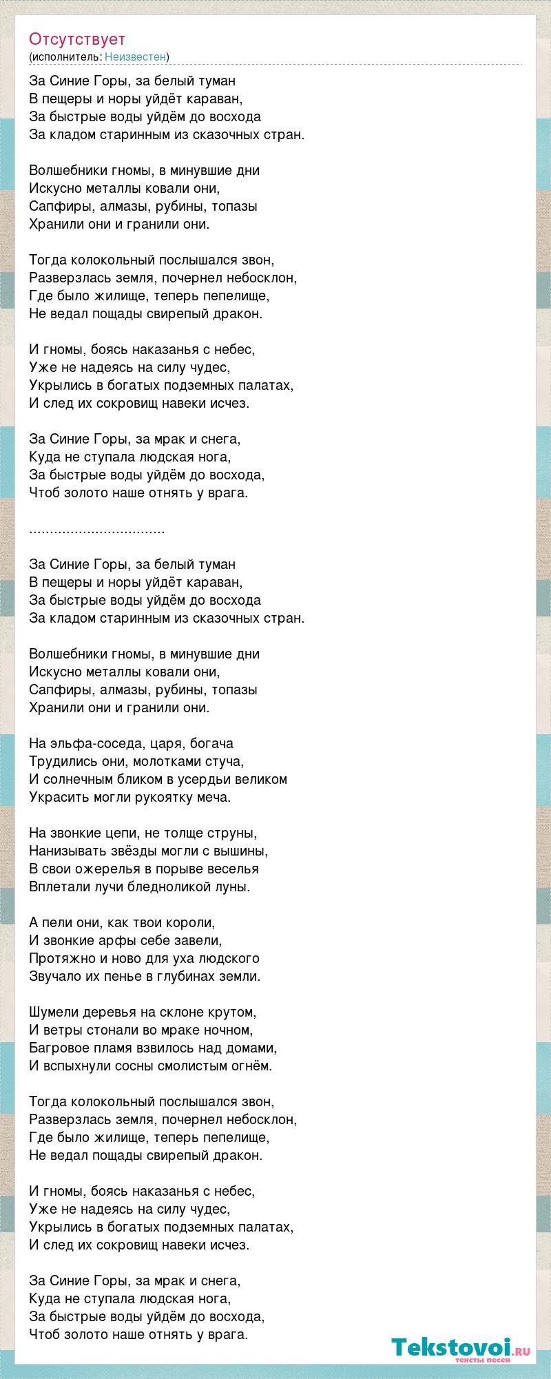 За Синие Горы, за белый туман В пещеры и норы уйдёт караван, За быстрые воды уйдём до восхода За кладом старинным из сказочных стран. Волшебники гномы, в минувшие дни Искусно металлы ковали они, Сапфиры, алмазы, рубины, топазы Хранили они и гранили они. Тогда колокольный послышался звон, Разверзлась земля, почернел небосклон, Где было жилище, теперь пепелище, Не ведал пощады свирепый дракон. И гномы, боясь наказанья с небес, Уже не надеясь на силу чудес, Укрылись в богатых подземных палатах, И след их сокровищ навеки исчез. За Синие Горы, за мрак и снега, Куда не ступала людская нога, За быстрые воды уйдём до восхода, Чтоб золото наше отнять у врага. ................................. За Синие Горы, за белый туман В пещеры и норы уйдёт караван, За быстрые воды уйдём до восхода За кладом старинным из сказочных стран. Волшебники гномы, в минувшие дни Искусно металлы ковали они, Сапфиры, алмазы, рубины, топазы Хранили они и гранили они. На эльфа-соседа, царя, богача Трудились они, молотками стуча, И солнечным бликом в усердьи великом Украсить могли рукоятку меча. На звонкие цепи, не толще струны, Нанизывать звёзды могли с вышины, В свои ожерелья в порыве веселья Вплетали лучи бледноликой луны. А пели они, как твои короли, И звонкие арфы себе завели, Протяжно и ново для уха людского Звучало их пенье в глубинах земли. Шумели деревья на склоне крутом, И ветры стонали во мраке ночном, Багровое пламя взвилось над домами, И вспыхнули сосны смолистым огнём. Тогда колокольный послышался звон, Разверзлась земля, почернел небосклон, Где было жилище, теперь пепелище, Не ведал пощады свирепый дракон. И гномы, боясь наказанья с небес, Уже не надеясь на силу чудес, Укрылись в богатых подземных палатах, И след их сокровищ навеки исчез. За Синие Горы, за мрак и снега, Куда не ступала людская нога, За быстрые воды уйдём до восхода, Чтоб золото наше отнять у врага.