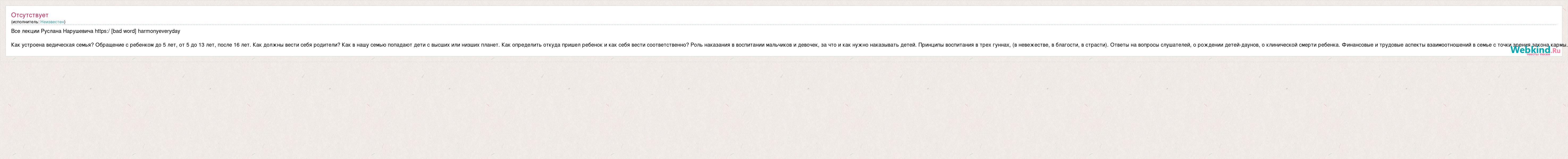 Все лекции Руслана Нарушевича https:/ [bad word] harmonyeveryday Как устроена ведическая семья? Обращение с ребенком до 5 лет, от 5 до 13 лет, после 16 лет. Как должны вести себя родители? Как в нашу семью попадают дети с высших или низших планет. Как определить откуда пришел ребенок и как себя вести соответственно? Роль наказания в воспитании мальчиков и девочек, за что и как нужно наказывать детей. Принципы воспитания в трех гуннах, (в невежестве, в благости, в страсти). Ответы на вопросы слушателей, о рождении детей-даунов, о клинической смерти ребенка. Финансовые и трудовые аспекты взаимоотношений в семье с точки зрения закона кармы.