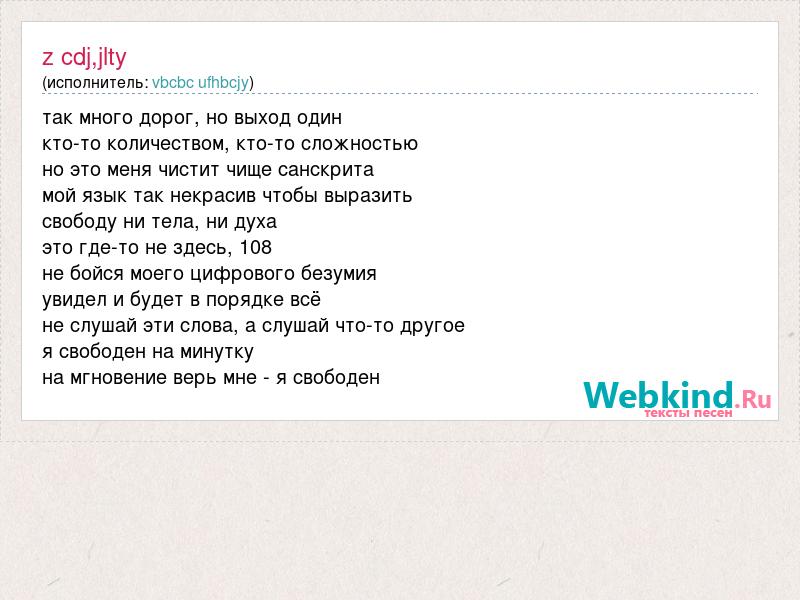 так много дорог, но выход один кто-то количеством, кто-то сложностью но это меня чистит чище санскрита мой язык так некрасив чтобы выразить свободу ни тела, ни духа это где-то не здесь, 108 не бойся моего цифрового безумия увидел и будет в порядке всё не слушай эти слова, а слушай что-то другое я свободен на минутку на мгновение верь мне - я свободен