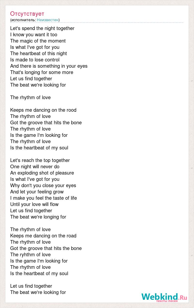Let's spend the night together I know you want it too The magic of the moment Is what I've got for you The heartbeat of this night Is made to lose control And there is something in your eyes That's longing for some more Let us find together The beat we're looking for The rhythm of love Keeps me dancing on the rood The rhythm of love Got the groove that hits the bone The rhythm of love Is the game I'm looking for The rhythm of love Is the heartbeat of my soul Let's reach the top together One night will never do An exploding shot of pleasure Is what I've got for you Why don't you close your eyes And let your feeling grow I make you feel the taste of life Until your love will flow Let us find together The beat we're longing for The rhythm of love Keeps me dancing on the road The rhythm of love Got the groove that hits the bone The ryhthm of love Is the game I'm looking for The rhythm of love Is the heartbeat of my soul Let us find together The beat we're looking for