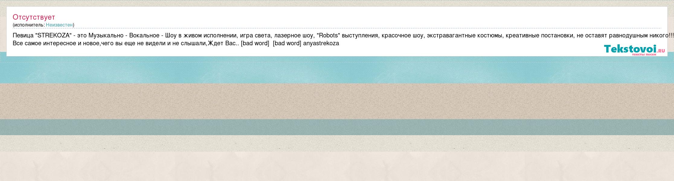 Певица "STREKOZA" - это Музыкально - Вокальное - Шоу в живом исполнении, игра света, лазерное шоу, "Robots" выступления, красочное шоу, экстравагантные костюмы, креативные постановки, не оставят равнодушным никого!!! Все самое интересное и новое,чего вы еще не видели и не слышали,Ждет Вас.. [bad word] [bad word] anyastrekoza
