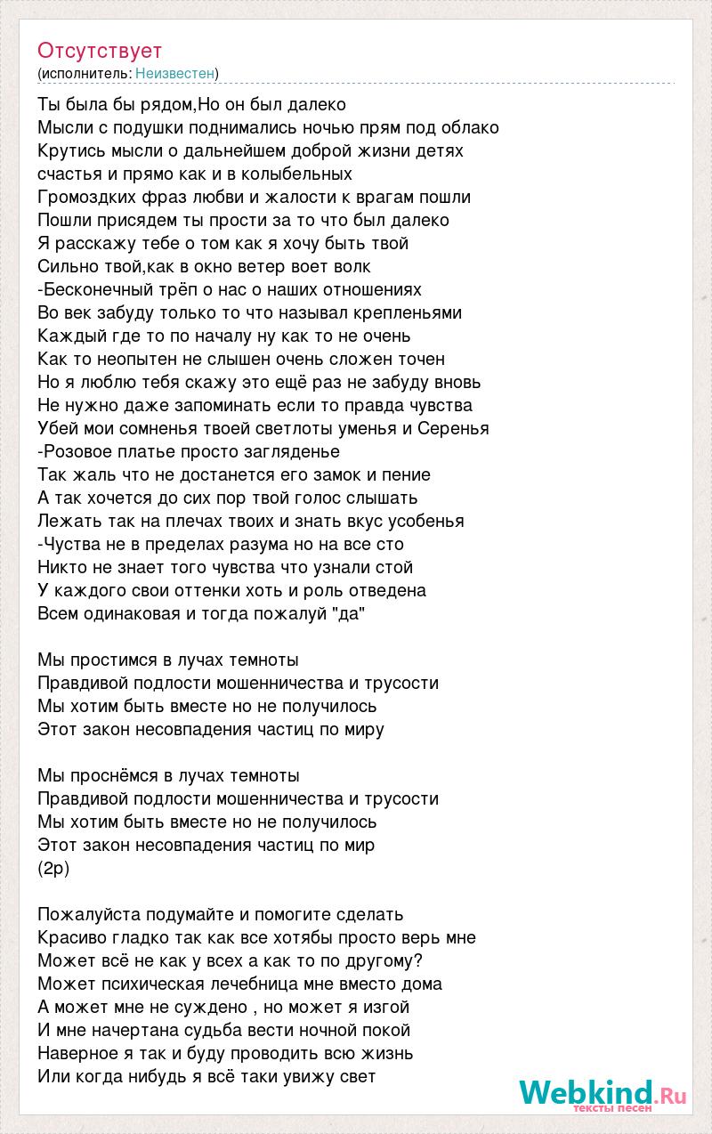 Ты была бы рядом,Но он был далеко Мысли с подушки поднимались ночью прям под облако Крутись мысли о дальнейшем доброй жизни детях счастья и прямо как и в колыбельных Громоздких фраз любви и жалости к врагам пошли Пошли присядем ты прости за то что был далеко Я расскажу тебе о том как я хочу быть твой Сильно твой,как в окно ветер воет волк -Бесконечный трёп о нас о наших отношениях Во век забуду только то что называл крепленьями Каждый где то по началу ну как то не очень Как то неопытен не слышен очень сложен точен Но я люблю тебя скажу это ещё раз не забуду вновь Не нужно даже запоминать если то правда чувства Убей мои сомненья твоей светлоты уменья и Серенья -Розовое платье просто загляденье Так жаль что не достанется его замок и пение А так хочется до сих пор твой голос слышать Лежать так на плечах твоих и знать вкус усобенья -Чуства не в пределах разума но на все сто Никто не знает того чувства что узнали стой У каждого свои оттенки хоть и роль отведена Всем одинаковая и тогда пожалуй "да" Мы простимся в лучах темноты Правдивой подлости мошенничества и трусости Мы хотим быть вместе но не получилось Этот закон несовпадения частиц по миру Мы проснёмся в лучах темноты Правдивой подлости мошенничества и трусости Мы хотим быть вместе но не получилось Этот закон несовпадения частиц по мир (2р) Пожалуйста подумайте и помогите сделать Красиво гладко так как все хотябы просто верь мне Может всё не как у всех а как то по другому? Может психическая лечебница мне вместо дома А может мне не суждено , но может я изгой И мне начертана судьба вести ночной покой Наверное я так и буду проводить всю жизнь Или когда нибудь я всё таки увижу свет