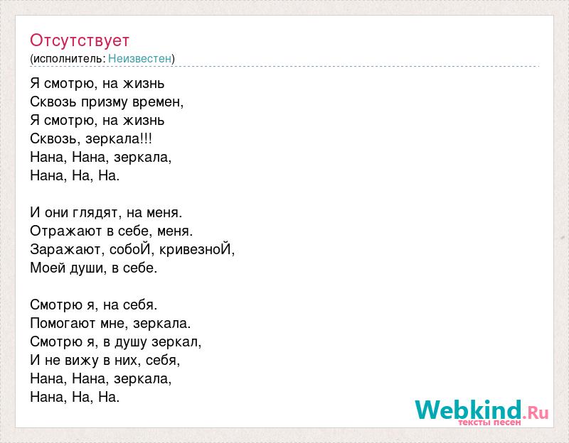 Я смотрю, на жизнь Сквозь призму времен, Я смотрю, на жизнь Сквозь, зеркала!!! Нана, Нана, зеркала, Нана, На, На. И они глядят, на меня. Отражают в себе, меня. Заражают, собоЙ, кривезноЙ, Моей души, в себе. Смотрю я, на себя. Помогают мне, зеркала. Смотрю я, в душу зеркал, И не вижу в них, себя, Нана, Нана, зеркала, Нана, На, На.