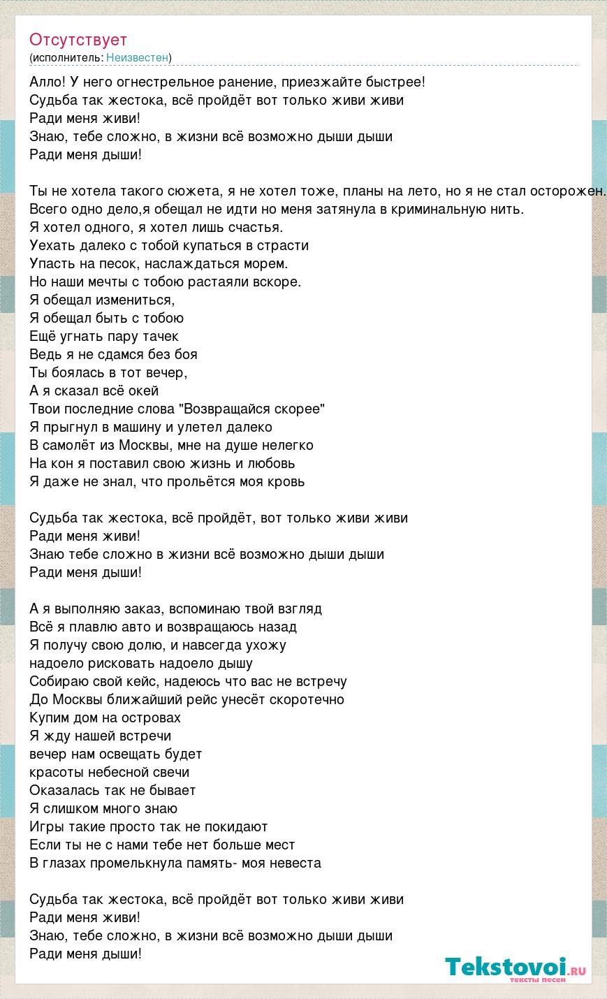 Алло! У него огнестрельное ранение, приезжайте быстрее! Судьба так жестока, всё пройдёт вот только живи живи Ради меня живи! Знаю, тебе сложно, в жизни всё возможно дыши дыши Ради меня дыши! Ты не хотела такого сюжета, я не хотел тоже, планы на лето, но я не стал осторожен. Всего одно дело,я обещал не идти но меня затянула в криминальную нить. Я хотел одного, я хотел лишь счастья. Уехать далеко с тобой купаться в страсти Упасть на песок, наслаждаться морем. Но наши мечты с тобою растаяли вскоре. Я обещал измениться, Я обещал быть с тобою Ещё угнать пару тачек Ведь я не сдамся без боя Ты боялась в тот вечер, А я сказал всё окей Твои последние слова "Возвращайся скорее" Я прыгнул в машину и улетел далеко В самолёт из Москвы, мне на душе нелегко На кон я поставил свою жизнь и любовь Я даже не знал, что прольётся моя кровь Судьба так жестока, всё пройдёт, вот только живи живи Ради меня живи! Знаю тебе сложно в жизни всё возможно дыши дыши Ради меня дыши! А я выполняю заказ, вспоминаю твой взгляд Всё я плавлю авто и возвращаюсь назад Я получу свою долю, и навсегда ухожу надоело рисковать надоело дышу Собираю свой кейс, надеюсь что вас не встречу До Москвы ближайший рейс унесёт скоротечно Купим дом на островах Я жду нашей встречи вечер нам освещать будет красоты небесной свечи Оказалась так не бывает Я слишком много знаю Игры такие просто так не покидают Если ты не с нами тебе нет больше мест В глазах промелькнула память- моя невеста Судьба так жестока, всё пройдёт вот только живи живи Ради меня живи! Знаю, тебе сложно, в жизни всё возможно дыши дыши Ради меня дыши!