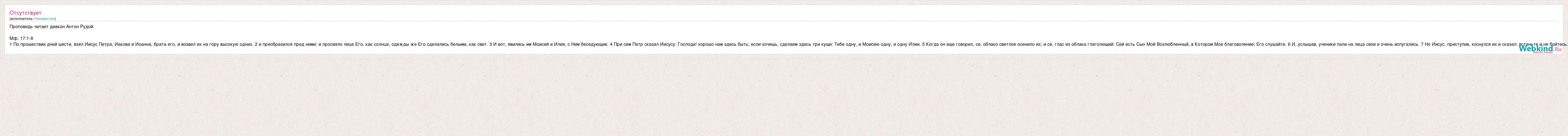 Проповедь читает диакон Антон Рудой. Мф. 17:1-8 1 По прошествии дней шести, взял Иисус Петра, Иакова и Иоанна, брата его, и возвел их на гору высокую одних, 2 и преобразился пред ними: и просияло лице Его, как солнце, одежды же Его сделались белыми, как свет. 3 И вот, явились им Моисей и Илия, с Ним беседующие. 4 При сем Петр сказал Иисусу: Господи! хорошо нам здесь быть; если хочешь, сделаем здесь три кущи: Тебе одну, и Моисею одну, и одну Илии. 5 Когда он еще говорил, се, облако светлое осенило их; и се, глас из облака глаголющий: Сей есть Сын Мой Возлюбленный, в Котором Мое благоволение; Его слушайте. 6 И, услышав, ученики пали на лица свои и очень испугались. 7 Но Иисус, приступив, коснулся их и сказал: встаньте и не бойтесь.
