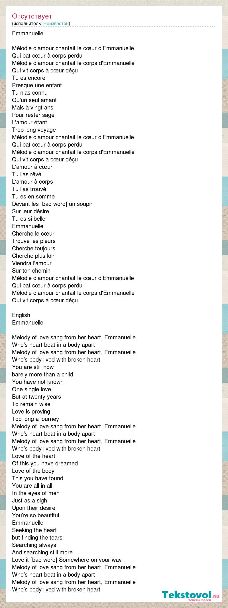 Emmanuelle Mélodie d'amour chantait le cœur d'Emmanuelle Qui bat cœur à corps perdu Mélodie d'amour chantait le corps d'Emmanuelle Qui vit corps à cœur déçu Tu es encore Presque une enfant Tu n'as connu Qu'un seul amant Mais à vingt ans Pour rester sage L'amour étant Trop long voyage Mélodie d'amour chantait le cœur d'Emmanuelle Qui bat cœur à corps perdu Mélodie d'amour chantait le corps d'Emmanuelle Qui vit corps à cœur déçu L'amour à cœur Tu l'as rêvé L'amour à corps Tu l'as trouvé Tu es en somme Devant les [bad word] un soupir Sur leur désire Tu es si belle Emmanuelle Cherche le cœur Trouve les pleurs Cherche toujours Cherche plus loin Viendra l'amour Sur ton chemin Mélodie d'amour chantait le cœur d'Emmanuelle Qui bat cœur à corps perdu Mélodie d'amour chantait le corps d'Emmanuelle Qui vit corps à cœur déçu English Emmanuelle Melody of love sang from her heart, Emmanuelle Who’s heart beat in a body apart Melody of love sang from her heart, Emmanuelle Who’s body lived with broken heart You are still now barely more than a child You have not known One single love But at twenty years To remain wise Love is proving Too long a journey Melody of love sang from her heart, Emmanuelle Who’s heart beat in a body apart Melody of love sang from her heart, Emmanuelle Who’s body lived with broken heart Love of the heart Of this you have dreamed Love of the body This you have found You are all in all In the eyes of men Just as a sigh Upon their desire You’re so beautiful Emmanuelle Seeking the heart but finding the tears Searching always And searching still more Love it [bad word] Somewhere on your way Melody of love sang from her heart, Emmanuelle Who’s heart beat in a body apart Melody of love sang from her heart, Emmanuelle Who’s body lived with broken heart
